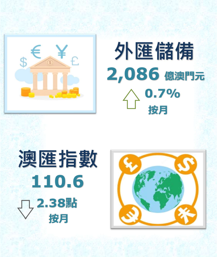 澳門金融管理局今日公佈,2022年12月底澳門特別行政區的外匯儲備資產總額,初步統計為2,086億澳門元(259.7億美元),較2022年11月經修訂總額2,071億澳門元(257.4億美元),上升了0.7%。2022年12月底的外匯資產總額,約相當於2022年11月底澳門流通貨幣的10倍或廣義貨幣供應(M2)中屬於澳門元部分的85.0%。