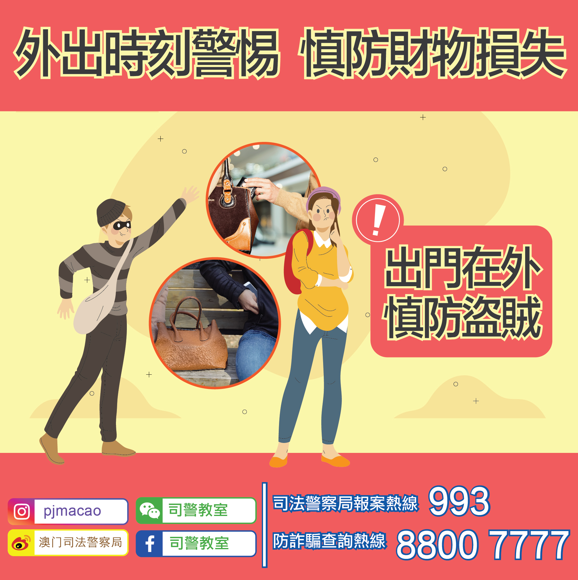 司警局特此呼籲市民,節假日期間盜竊案件易發,外出活動時應小心保管好個人財物,避免成為賊人的目標。