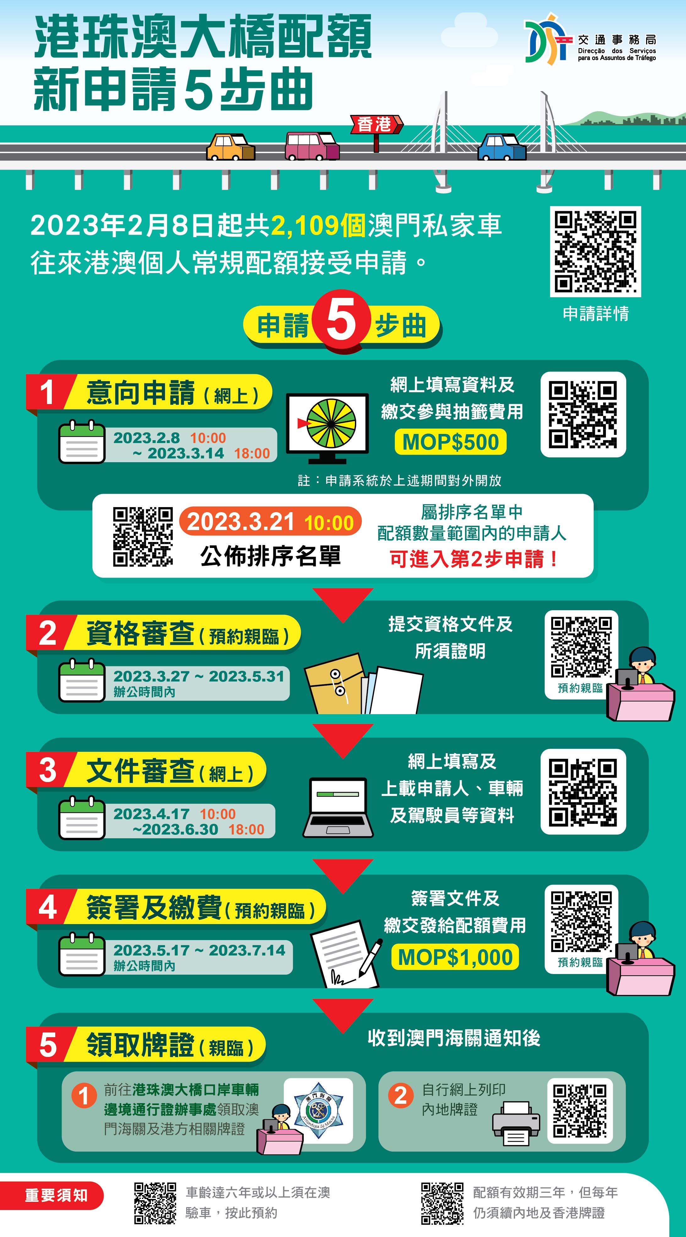 有關配額申請分兩階段進行,分別是:意向申請及配額分發申請。合資格人士於2023年3月14日前完成網上提交意向申請及繳費後,排序名單將於2023年3月21公佈,排名在首2,109位之申請人其後進入配額分發申請階段,須按指定時間透過網上及親臨馬交石服務專區遞交文件及繳費。倘於2023年內新增相關常規配額,將按是次抽籤排序名單的順序接續分發。