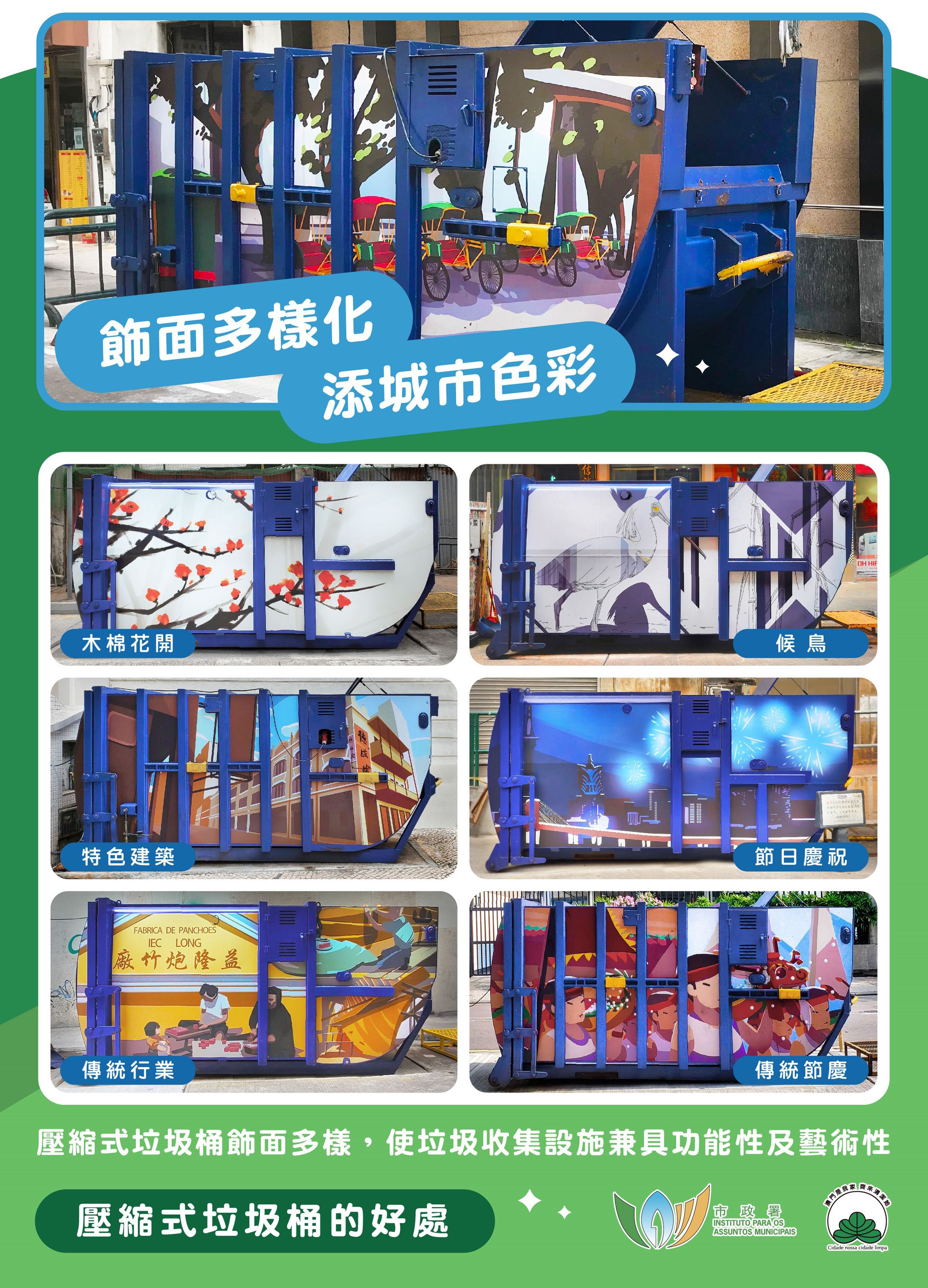 目前,全澳有壓縮式垃圾桶124個、封閉式垃圾房122個,傳統垃圾桶數量已由高峰期逾1,600個減少至104個,減幅逾9成。市政署未來將持續推動系列優化垃圾收集措施,包括:在壓縮式垃圾桶增設自動投入口,提升密封性及便利性;受環境空間所限,未具條件設置壓縮式垃圾桶或封閉式垃圾房的垃圾站,加設覆蓋外箱,外箱上蓋以液壓裝置牽引,居民輕踩腳踏即開啓上蓋,棄置垃圾後,上蓋自動關閉,減少臭味飄散和揚塵,避免垃圾外露;增加壓縮式垃圾桶、垃圾房的飾面美化和綠化。