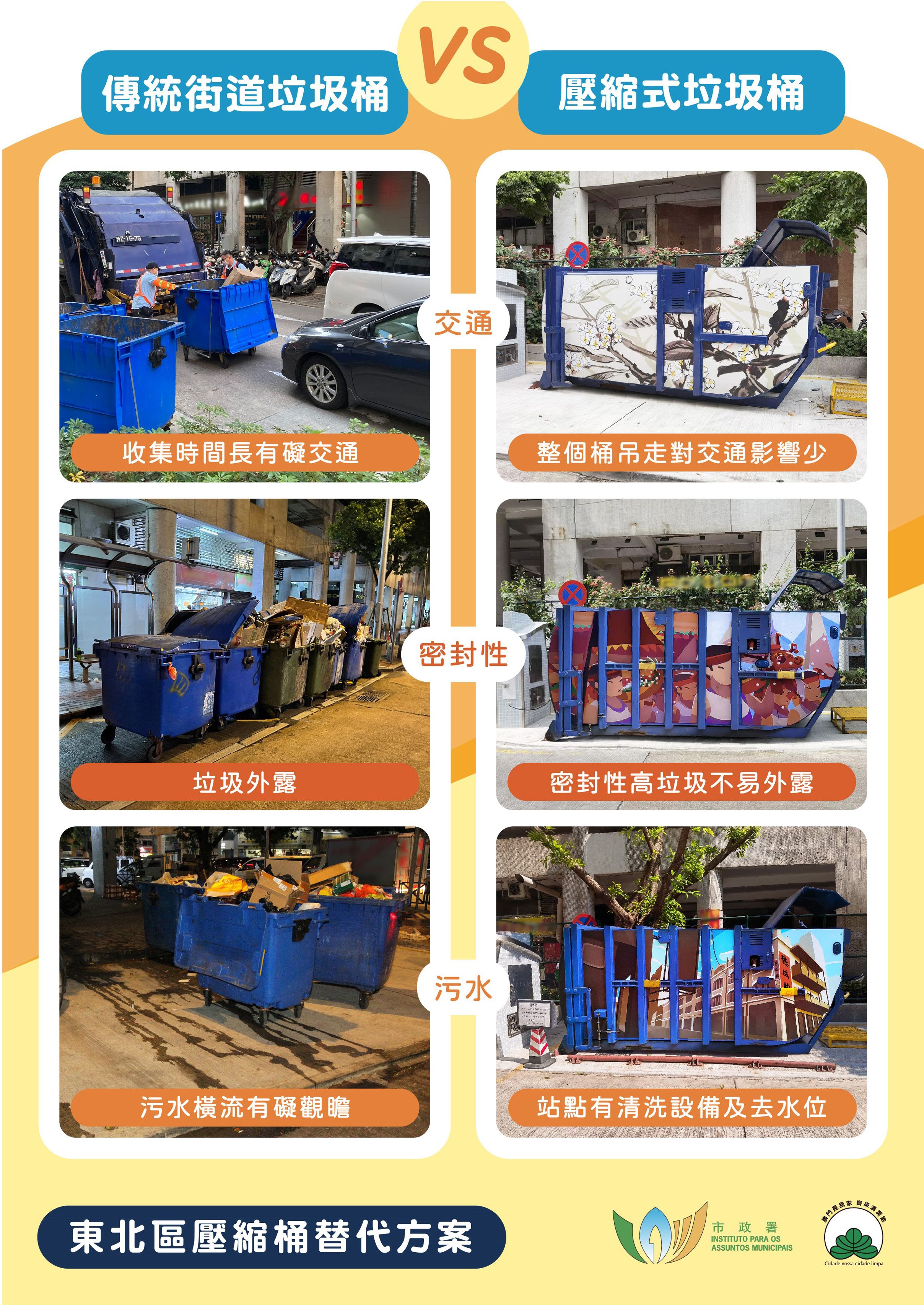 以壓縮式垃圾桶優化東北區垃圾收集模式獲得區內大廈物管公司的支持及配合,由大廈管理公司每晚把收集到的垃圾直接棄置於壓縮桶內,即時收回垃圾桶,避免了過往垃圾桶林立於街道兩旁的情況。在每一個新壓縮桶站投入運作前,市政署為附近大廈物管公司人員提供專場培訓。同時,市政署也採取在壓縮式垃圾桶周邊種植物、加設高身花圃及美化桶身飾面等系列措施。