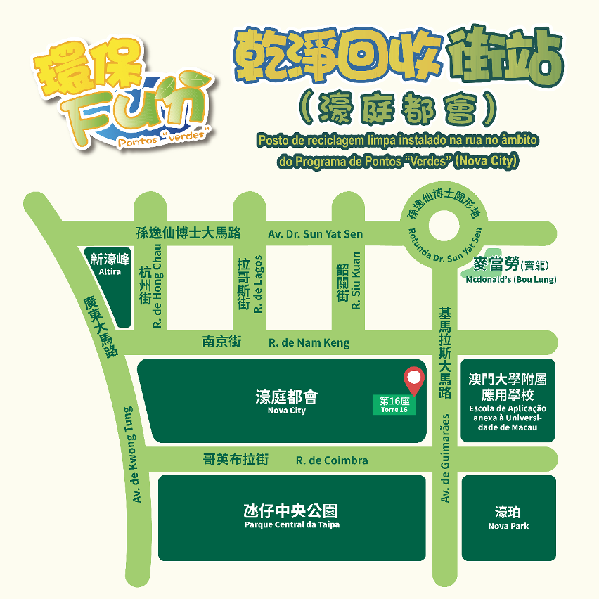 環境保護局持續優化並擴展資源回收網絡,今年已率先在氹仔濠庭都會第十六座旁新增一個“環保Fun乾淨回收街站”,提供更多元化的回收服務、更長的開放時間,便捷市民實踐乾淨回收。
