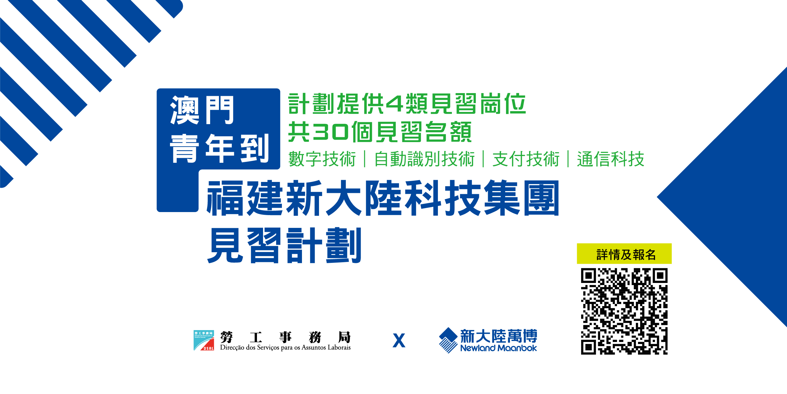 為配合特區政府“1+4”適度多元發展策略,優化產業結構而加快培養產業人才,勞工事務局(下稱 “勞工局”)與新大陸科技集團(下稱 “新大陸”)合作推出 “澳門青年到福建新大陸科技集團見習計劃”(下稱 “計劃”)。計劃由即日(1日)起至2月15日接受申請,歡迎合資格人士登入計劃專頁了解詳情及進行網上申請。