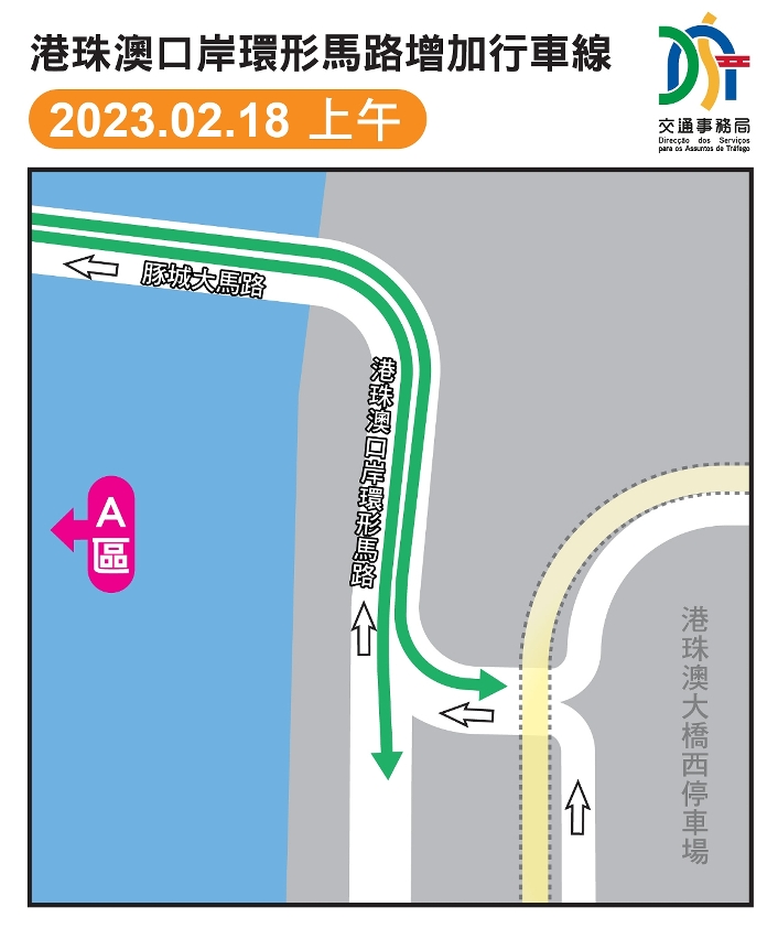 隨著新城填海A區建設發展及進出港珠澳大橋人工島之車流量日益增加,A區之交通需求呈持續增長趨勢。為優化A區往港珠澳大橋人工島的行車安排,交通事務局經評估周邊的交通狀況及道路條件,將靠近港珠澳大橋人工島入口的一段港珠澳口岸環形馬路改為雙線行車,增加一條行車線,以便車輛分別駛往港珠澳大橋澳門口岸的出境車道、入境大堂及西停車場等方向,減少該路口的車輛交織情況。新增之行車線將於2月18日(周六)上午完成地面標線後隨即開通。