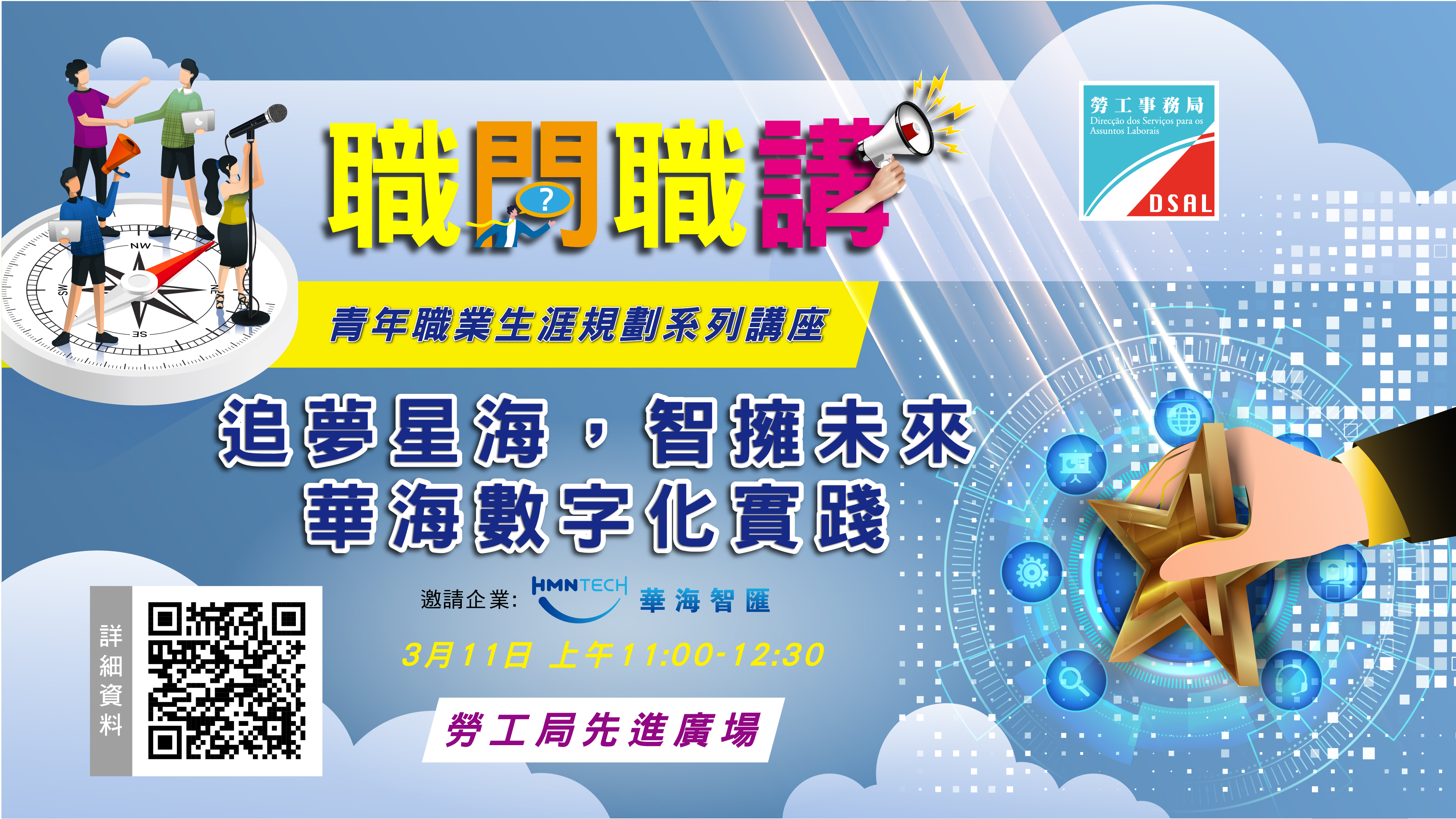 講座於3月11日(星期六)上午11時在勞工局先進廣場辦事處多功能室舉行,主題為 “追夢星海,智擁未來,華海數字化實踐分享”,由華海港澳及華南區解決方案康磊主管主講。通過講座介紹智慧類項目建設、集成解決方案和數字化轉型技術等資訊,並即場回答青年對有關行業前景方面的查詢。