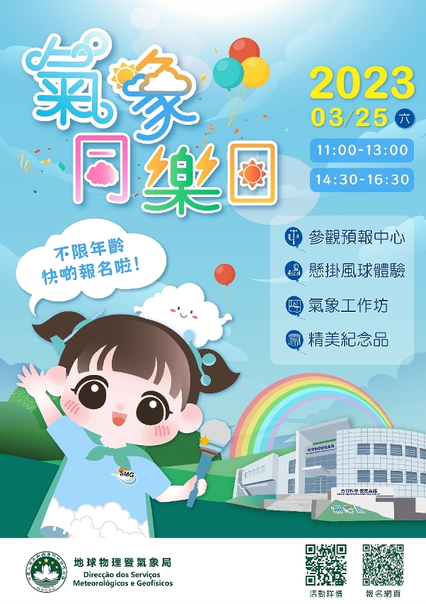 為慶祝3月23日世界氣象日及加強公眾對氣象工作的認識,地球物理暨氣象局於3月25日(星期六)舉辦兩場“氣象同樂日”活動,藉以帶領參加者走一趟氣象之旅,透過實地參觀和體驗操作氣象儀器,瞭解天氣預報的運作及加深對氣象科普的認識,同場特設小小天氣預報員體驗、懸掛風球體驗及氣象工作坊等精彩節目。活動由即日起至3月15日接受網上報名,參加者於活動結束後可領取精美紀念品乙份。