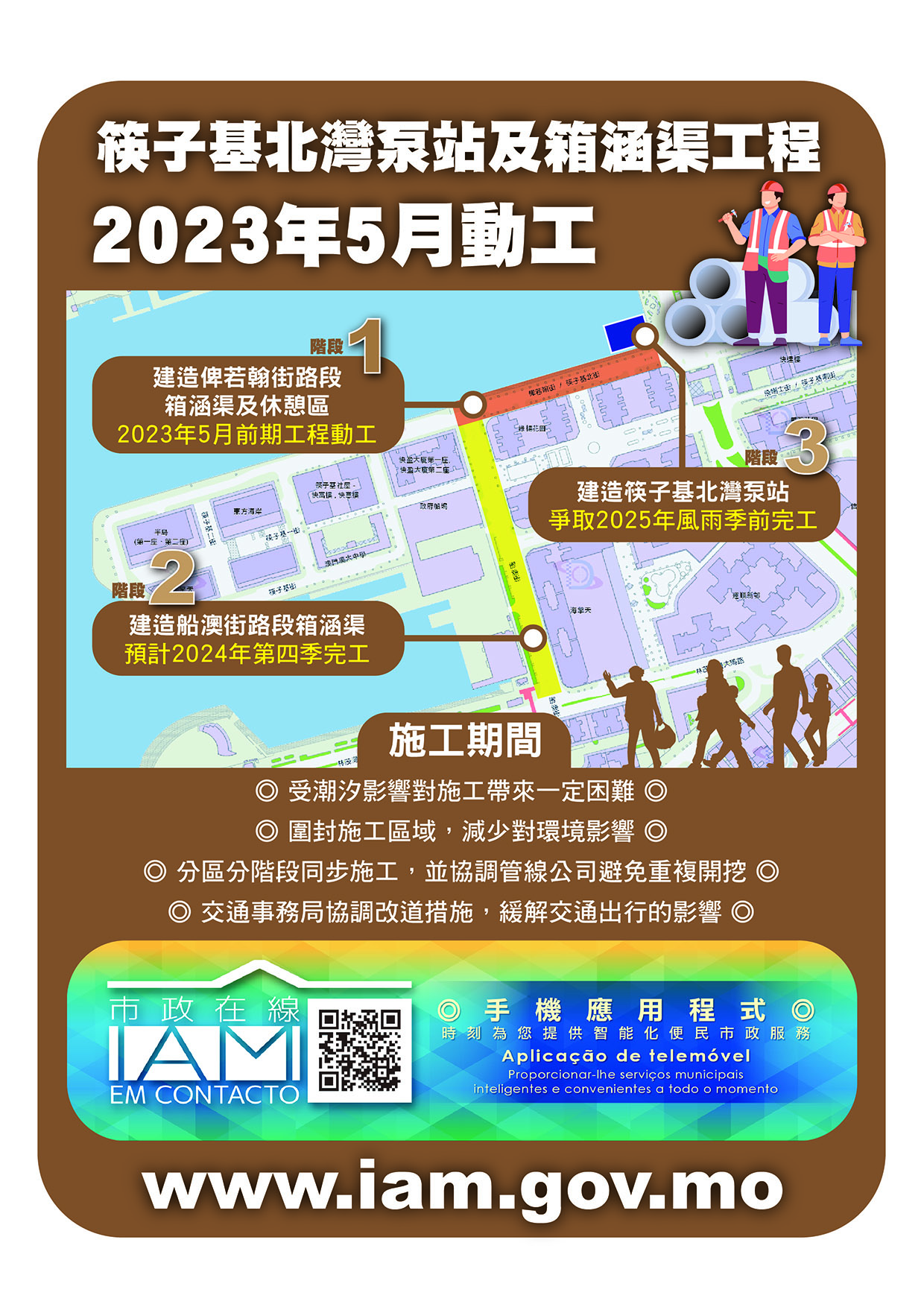 首期工程將於5月19日動工,爭取2024年下半年完成建造箱涵渠,而泵站土建部份則於2025年完成,隨後進入調試期,以達致最佳運行效果。由於工程位置在人口稠密區域,且靠近堤岸,受潮汐變化影響大,施工具一定難度,市政署將制定預案,透過各種措施,與交通事務局做好協調工作,控制工程進度,盡可能降低對交通的影響,並因應區內複雜的地下管線設施,協調各專營公司的工程,避免重複開挖。