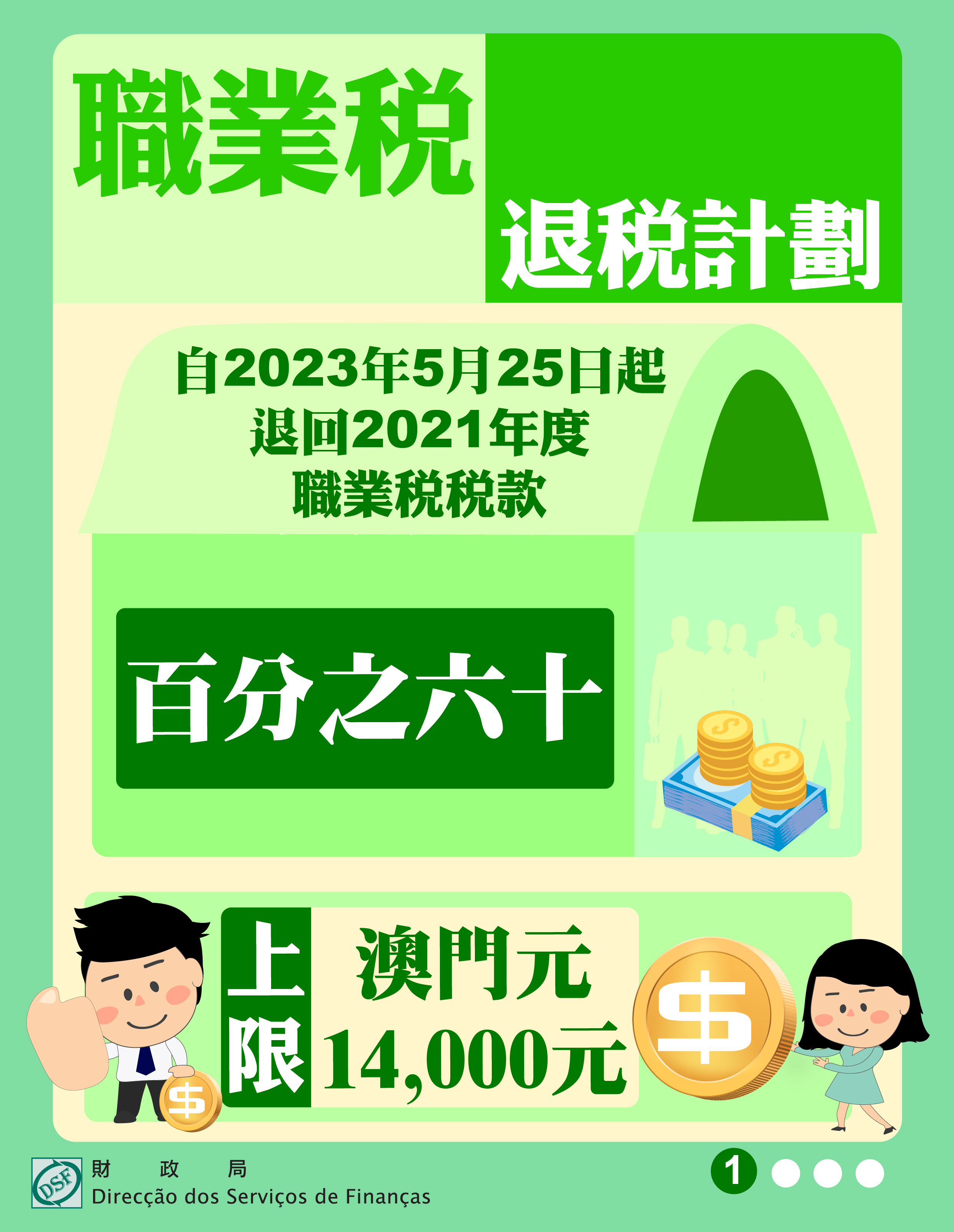 財政局將於5月25日起向符合資格的澳門居民退還2021年度已繳納的職業稅稅款百分之六十,上限為澳門元14,000元。