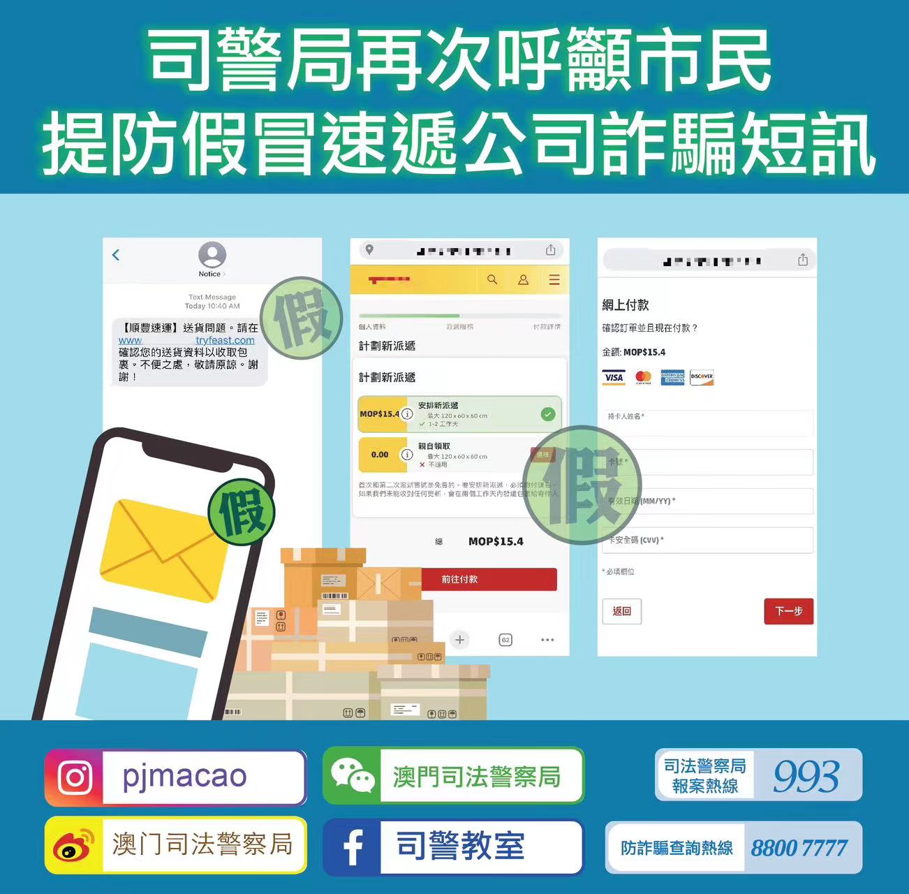 司警局再次呼籲市民提防假冒速遞公司詐騙短訊