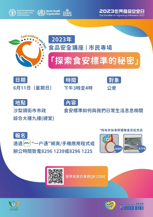 為響應今年世界食品安全日的主題“食安標準 安全所繫”,市政署將於六月十一日舉辦“探索食安標準的秘密”的市民專場講座,加強市民對本澳食安標準的認識,藉此建立科學、理性的食安觀念,為個人健康把關。講座費用全免,歡迎市民踴躍報名參與。