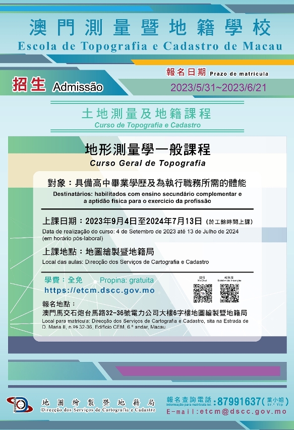“地形測量學一般課程”為分成兩個學期之一學年制課程,對象為具備高中畢業學歷的澳門居民,以中文授課,學費全免,工餘時間上課。欲報讀有關課程的人士可於2023年5月31日至6月21日辧公時間內,前往地圖繪製暨地籍局6樓提交報名表格,並附同澳門居民身份證、學歷證明文件及近照一張,報名詳情亦可瀏覽澳門測量暨地籍學校網頁(https://etcm.dscc.gov.mo/)或致電87991637(葉小姐)查詢。