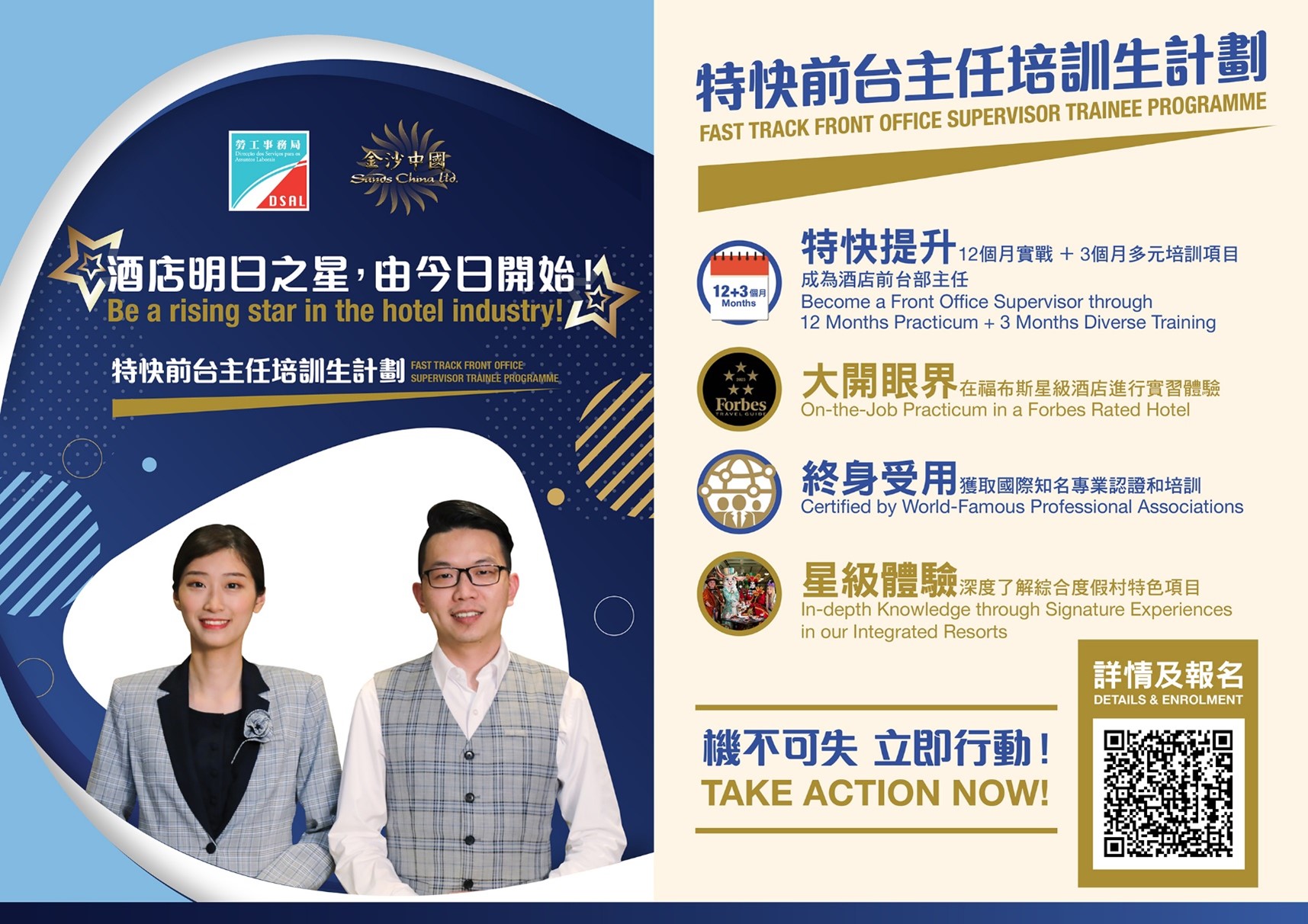 隨著澳門旅遊業復甦,來澳旅客數量大增,酒店入住率亦有明顯升幅。為滿足旅客需求及向旅客提供國際級的服務,酒店對於前線營運人才的需求亦隨之增加。基此,為協助本澳居民投身相關職位,勞工事務局與金沙中國合辦“特快前台主任培訓生計劃",培養綜合旅遊休閒服務人才。計劃於6月13日起接受申請,有意在綜合旅遊休閒服務領域拓展職涯的居民,請把握機會參加。