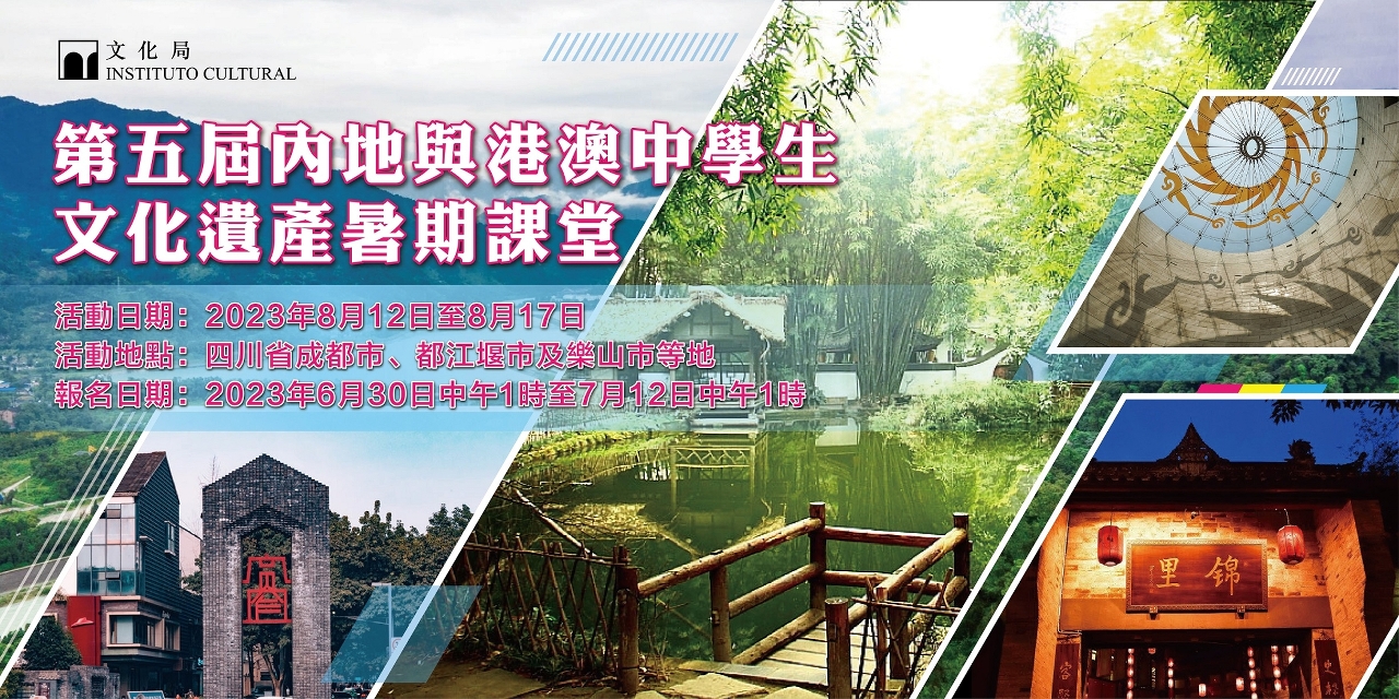 由國家文物局、香港特別行政區政府發展局、澳門特別行政區政府文化局主辦,四川省文物局、中華文物交流協會、香港特別行政區政府古物古蹟辦事處、澳門特別行政區政府文化局文化遺產廳承辦,澳門特別行政區政府教育及青年發展局支持的“第五屆內地與港澳中學生文化遺產暑期課堂”,將於8月12至17日於四川省成都市、都江堰市及樂山市等地舉行,現正公開招募學員,歡迎有興趣的本澳高中學生報名參加。
