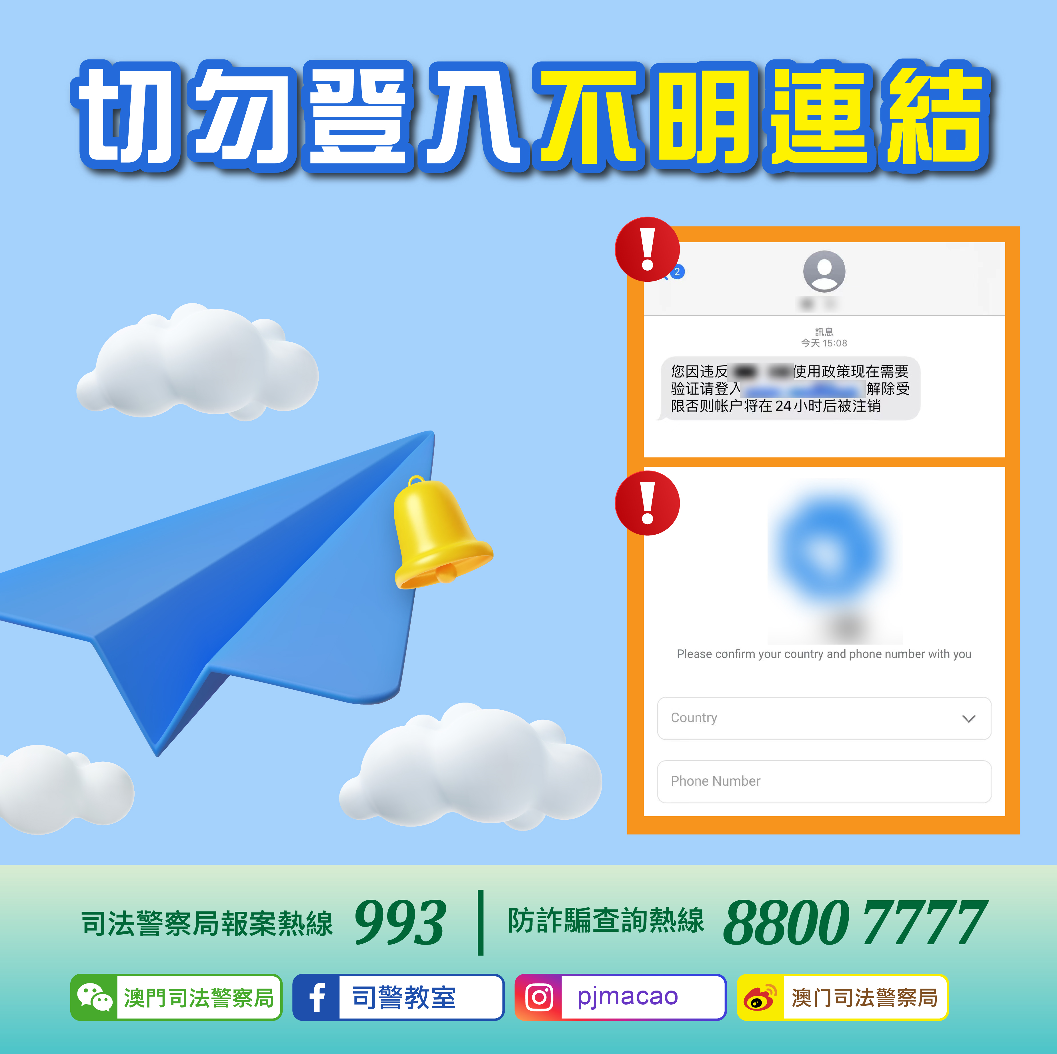 近日,司法警察局發現有不法分子向市民隨機發送附有不明連結之短訊,內容為訛稱市民的手機通訊軟件帳戶因違反使用政策而受限制,誘騙市民點擊短訊內的連結以進入一個與官方網站內容及版面極為相似之釣魚網站,企圖令市民輸入帳戶號碼及驗證碼等資料,藉此盜取相關通訊軟件的帳號使用權。