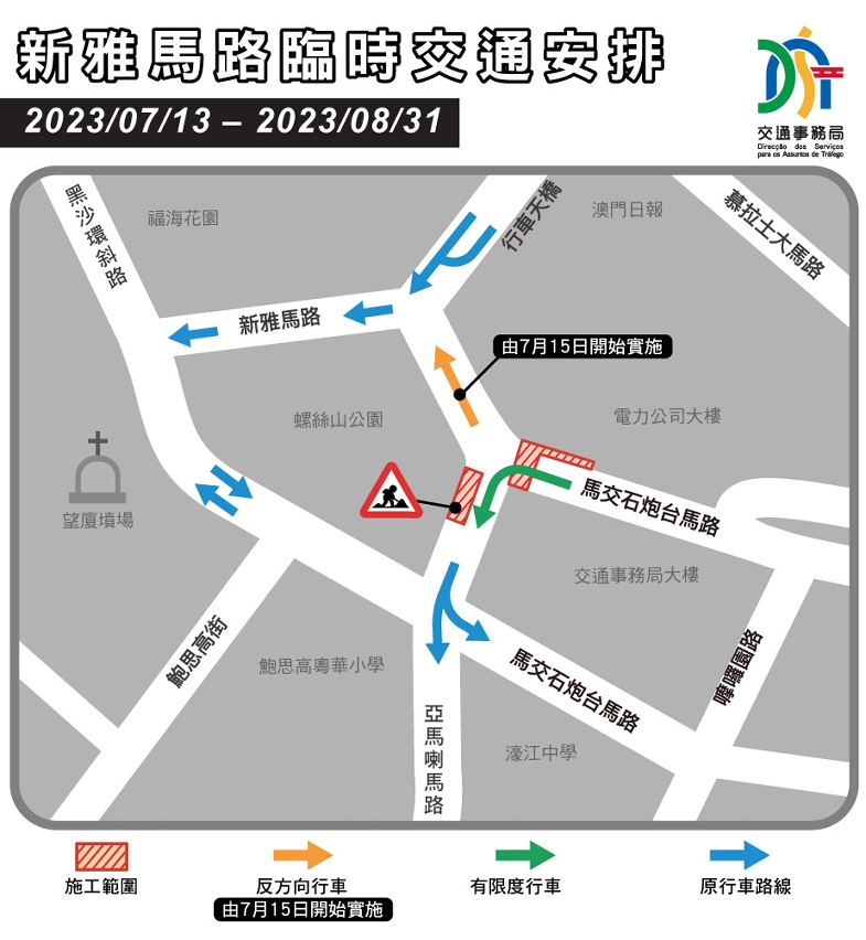 配合公共建設局接駁街渠及自來水公司水管鋪設工程,7月13日(周四)至8月31日(周四),新雅馬路及馬交石炮台馬路實施臨時交通安排,詳見附表。期間,巴士2、2A、6A、18、18A、18B及H2路線由7月15日上午10時起需改道行駛,但停靠站點不受影響。