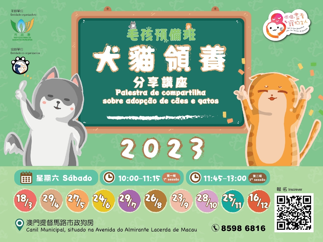 市政署於八月續與動保團體合辦動保教育活動,包括“毛孩預備班─寵物資訊站”、“犬貓領養分享講座”,以多元方式宣傳養寵知識及飼主責任等內容。各項活動費用全免,歡迎市民踴躍參加。