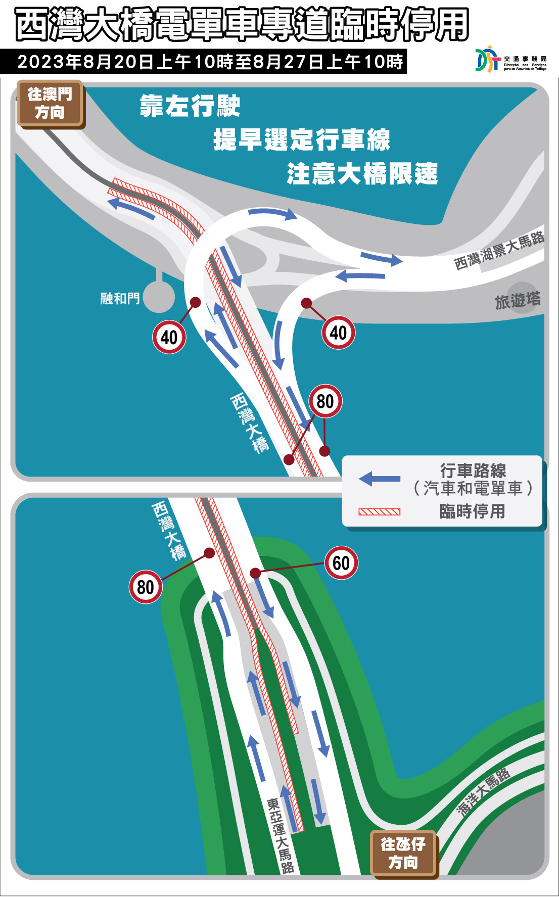 配合西灣大橋更換伸縮縫工程推進,8月20日(周日)上午10時至8月27日(周日)上午10時,須臨時停用西灣大橋電單車專道,以便進行專道內伸縮縫的更換工作。期間,電單車可在西灣大橋其他車道行駛,並可使用西灣大橋的各個出入口,即西灣湖景大馬路近媽閣及近旅遊塔一側引橋,以及氹仔東亞運大馬路上層及下層之引橋進出西灣大橋。
