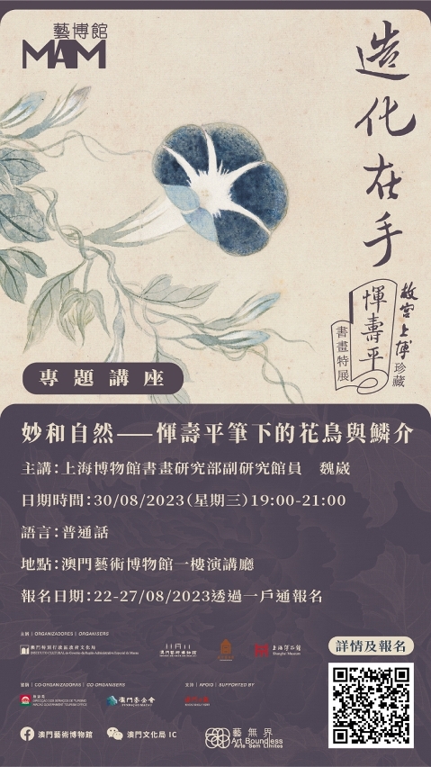 為深化惲壽平以至清代繪畫發展的學術研究,藝博館特於開幕前後舉辦學術交流活動,8月30日晚上7時至9時舉行“妙和自然──惲壽平筆下的花鳥與鱗介”專題講座,將由上海博物館書畫研究部副研究館員魏崴深入分析其花鳥畫的題材和技法;9月2日上午9時30分至12時15分、下午3時至5時35分舉辦之學術研討會,將由故宮博物院書畫部研究館員田藝珉、上海博物館書畫研究部主任凌利中擔任學術主持,聯同多位來自故宮博物院、上海博物館、中國國家博物館、南京博物院、香港故宮文化博物館及澳門藝術博物館的專家學者,就惲壽平的題材風格、承傳與影響、創作思想、作品鑑賞等研究主題進行研討。上述活動於藝博館一樓演講廳以普通話進行,免費參加,有興趣人士即日起可透過一戶通的“活動報名”(activity.mo.gov.mo/activity-h5/)進行登記,名額有限,抽籤錄取。