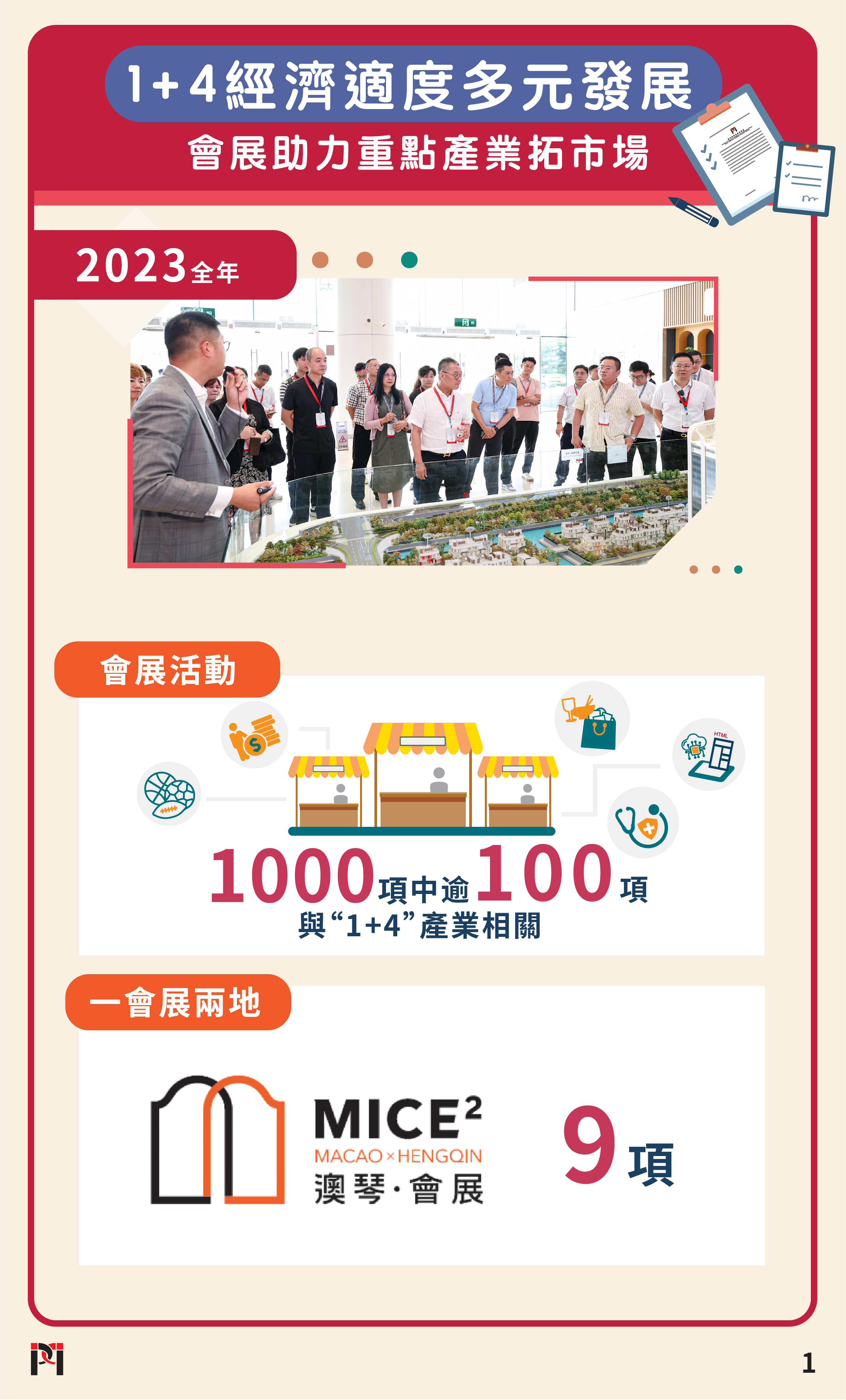 為深化會展“以展招商”的工作及配合特區政府的“1+4”適度多元發展策略,由澳門貿易投資促進局主/承辦的會展活動聚焦不同產業。如“第14屆國際基礎設施投資與建設高峰論壇”的基礎建設、“2023粵澳名優商品展”的餐飲業,“2023年澳門國際環保合作發展論壇及展覽”的環保業,透過系列精準商業配對、專題論壇提升企業對接成效。3項會展活動促成逾130份簽約項目及合作協議和900多場商業配對。