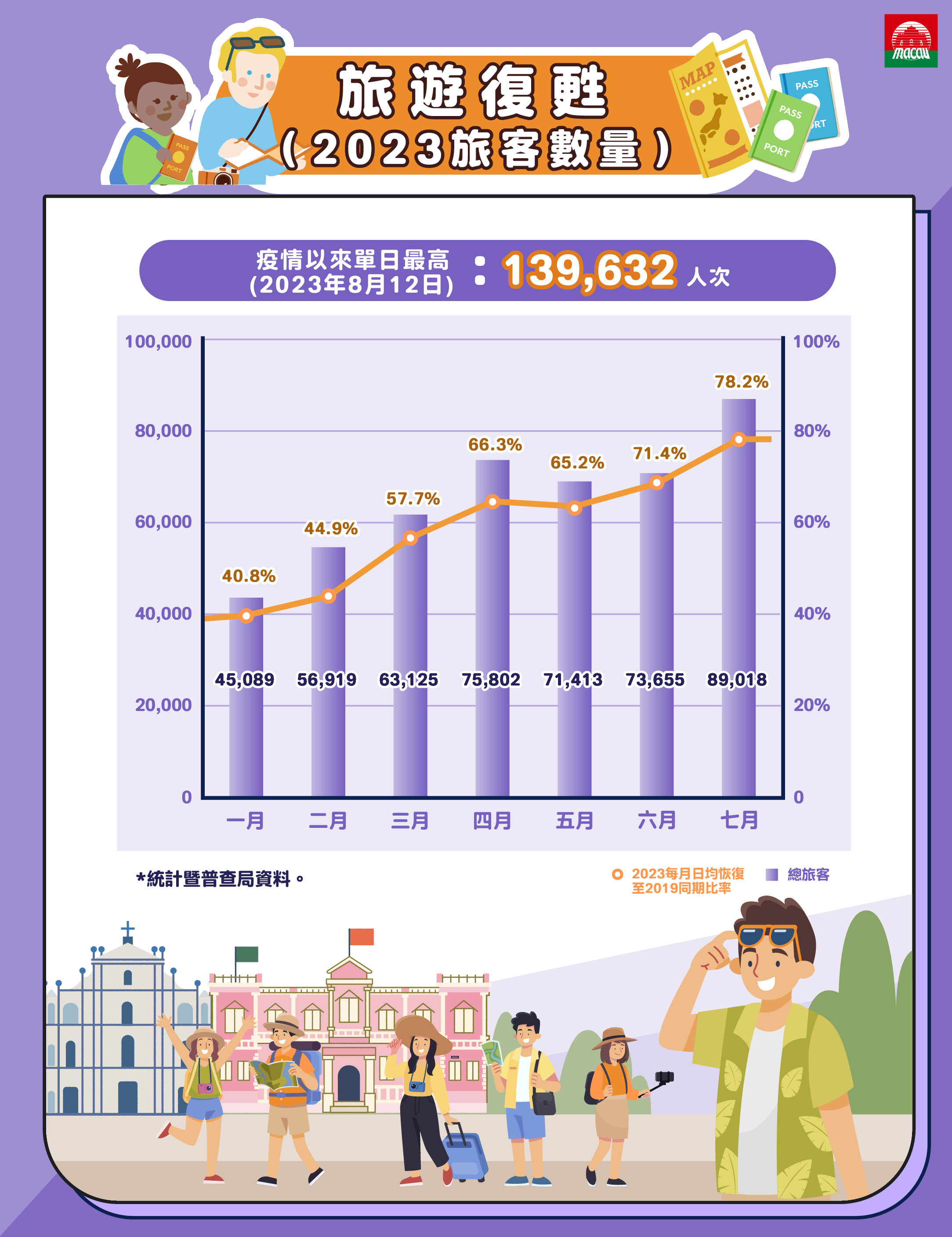 澳門入境旅客方面,統計暨普查局最新公佈,今年1至7月入境旅客累計錄得1,440.5萬人次。7月訪澳旅客情況理想,日均入境旅客恢復至疫情前2019年同期78.2%,其中,內地旅客7月日均人次恢復至2019年同期74.3%。暑假旅遊旺季,訪澳旅客進一步增加,根據臨時數據,8月12日錄得13.9萬人次,創今年以來最高單日入境人次,也是3年半以來最高。