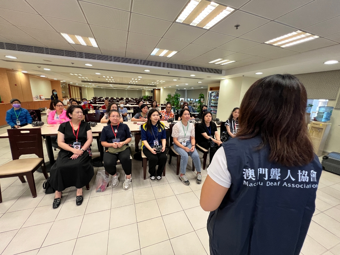 活動於8月26日下午在司警局總部大樓舉行。活動中,澳門聾人協會導師向“司警局婦女防罪之友”成員介紹該中心的服務和運作,並教授與聽障人士溝通的技巧和實用手語;隨後進行無聲體驗環節,安排成員們在模擬茶餐廳的場景中體驗聽障人士在日常生活中面臨的不便之處,進而增進並發揮其同理心,瞭解如何與聽障人士溝通和相處,最終做到“多一點認識,多一點接納”。