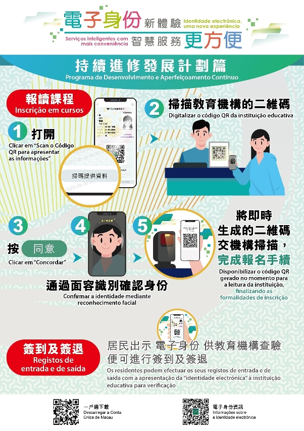 有關《持續進修發展計劃》詳情,請參閱相關專題網頁(https://www.dsedj.gov.mo/pdac/)。更多“電子身份”資訊,請瀏覽專題網頁(https://www.dsi.gov.mo/eid/index.html)。如有查詢,請致電身份證明局熱線(2837-0777或2837-0888)。