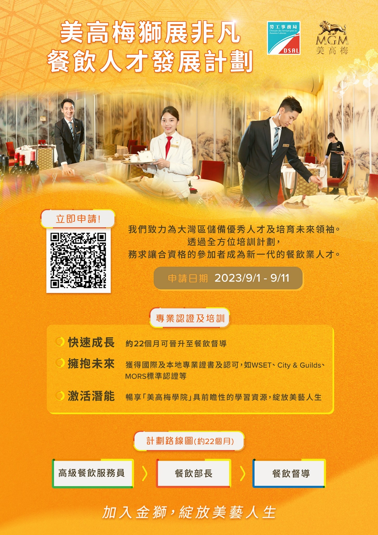為進一步培育本地餐飲服務人才,並提供發展階梯,勞工事務局和美高梅金殿超濠股份有限公司(下稱“美高梅")合作推出“美高梅獅展非凡餐飲人才發展計劃"(下稱“計劃"),以“先入職、後培訓”方式,協助符合條件和有意從事餐飲服務業的澳門居民就業,計劃由9月1日起接受申請。