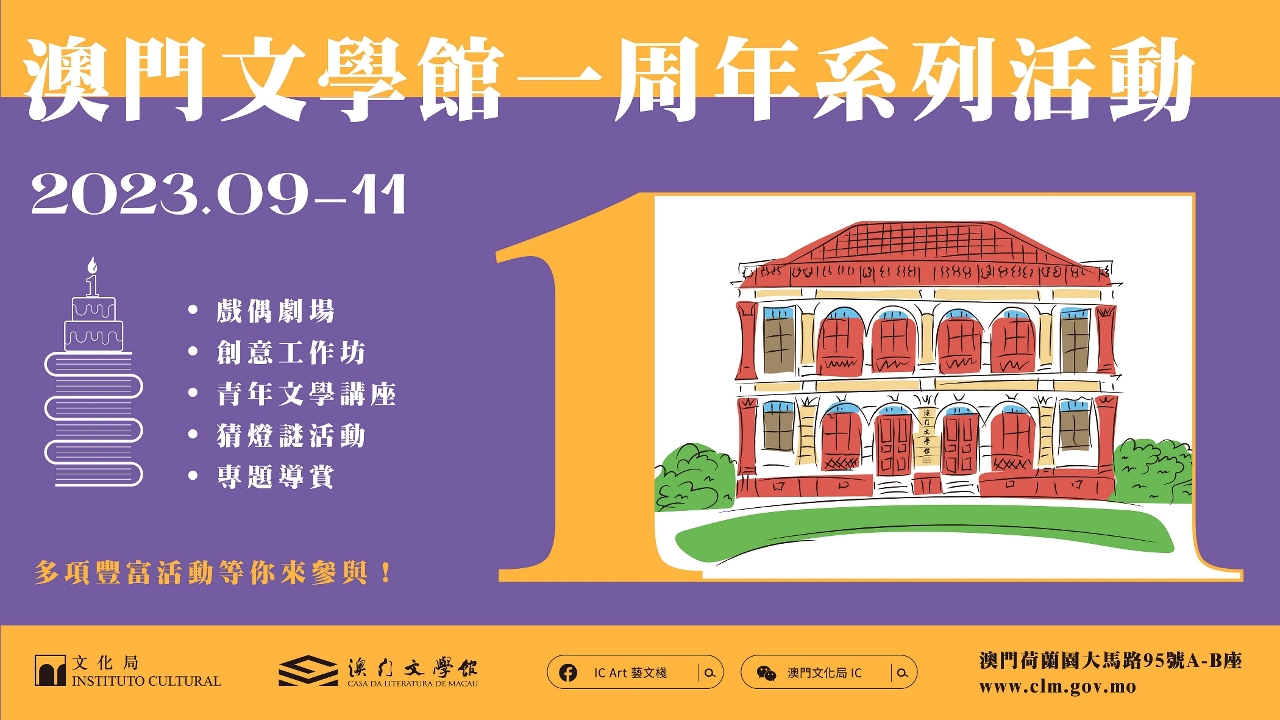 文學館亦將於9月至12月期間舉辦以學校為報名單位的“澳門文學館戲偶劇場計劃——尋找爺爺的寶藏”活動,由專業人員帶領本澳幼小學生遊走澳門文學館的各個空間,透過互動有趣的戲偶方式講述不同文學作家的小故事,發掘珍貴的澳門文學寶藏。11月份舉辦“粵港澳大灣區青年文學講座”,邀請三位來自粵港澳大灣區的青年作家代表,包括陳崇正、羅旭和莫羲世進行三場專題演講及分享,推廣灣區文學及加強三地之間的文化交流,提高本澳青年對文學創作的興趣,有關報名詳情將另行公佈。活動詳情可瀏覽澳門文學館網頁(www.clm.gov.mo),查詢可於辦公時間致電8399 6441或8399 6331。
