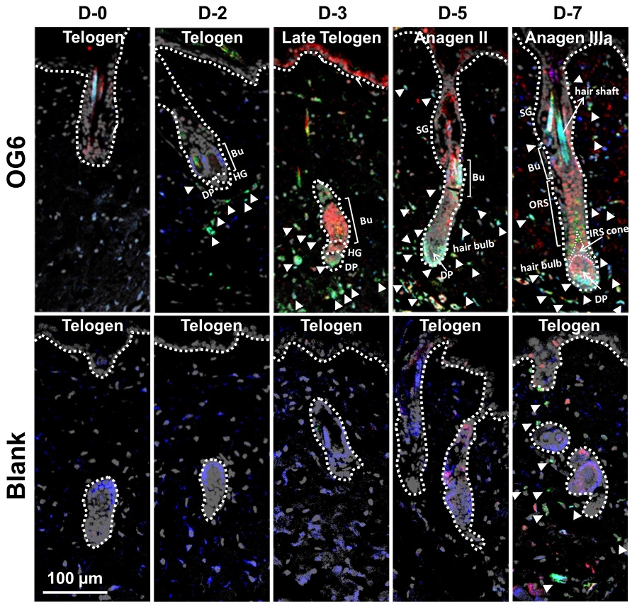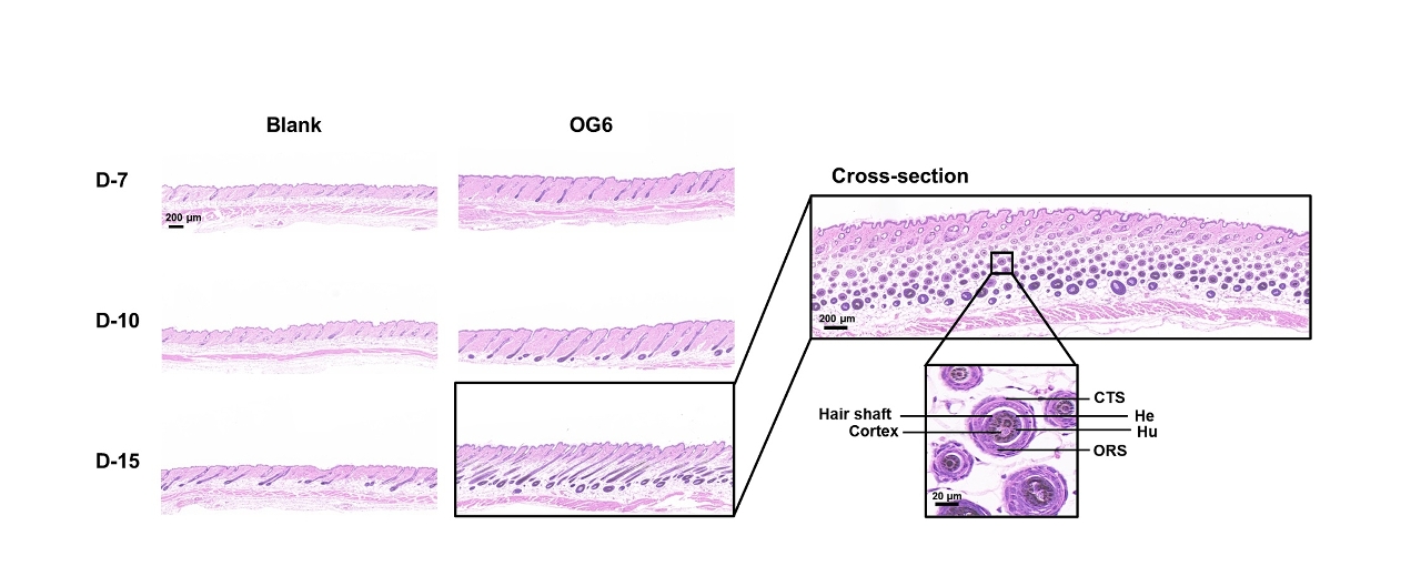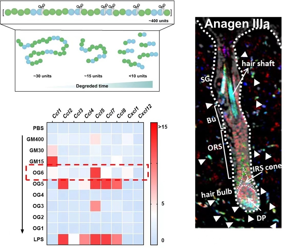 王春明表示,哺乳動物的毛髮從毛囊中長出,其生長具有週期性,從靜止期到生長期的轉變受局部組織的生理微環境調控。毛囊附近某類免疫細胞數量或某類細胞因子濃度的變化,都可能刺激毛囊生長,但這些變化難以精準控制。在該研究中,團隊優選出一種“纖維素酶”,如同剪刀一般,可將天然藥物蒟蒻來源的葡甘聚糖,從非常大的分子“剪”成比較小的分子片段。從一系列比較小的片段中,研究人員找到一個代號為OG6的寡糖組分,可以精確誘導皮膚中的特定細胞釋放一種名爲“趨化因子”的信號(CCL5)。這個信號如同交通燈,可引導一類名為調節性T細胞的免疫細胞遷移到毛囊周圍,和毛囊幹細胞發生作用,刺激毛囊進入生長期。有趣的是,無論是作為原料的大分子還是酶解同時獲得的其他組分,都不具備OG6的這一特異活性。團隊猜測,這一“剪”,暴露出了寡糖被多糖分子鏈所掩蓋的“隱藏活性”。團隊在使用多種生物學方法驗證了OG6的作用機制後,將OG6注射到褪毛後的野生小鼠及轉基因報告小鼠皮內,觀察到健康的毛髮在注射部位快速新生,且未出現皮膚過敏或任何毒副作用。更為重要的是,OG6在體內最終降解產物是葡萄糖和甘露糖兩種人體內本身存在的物質,預計安全性高。