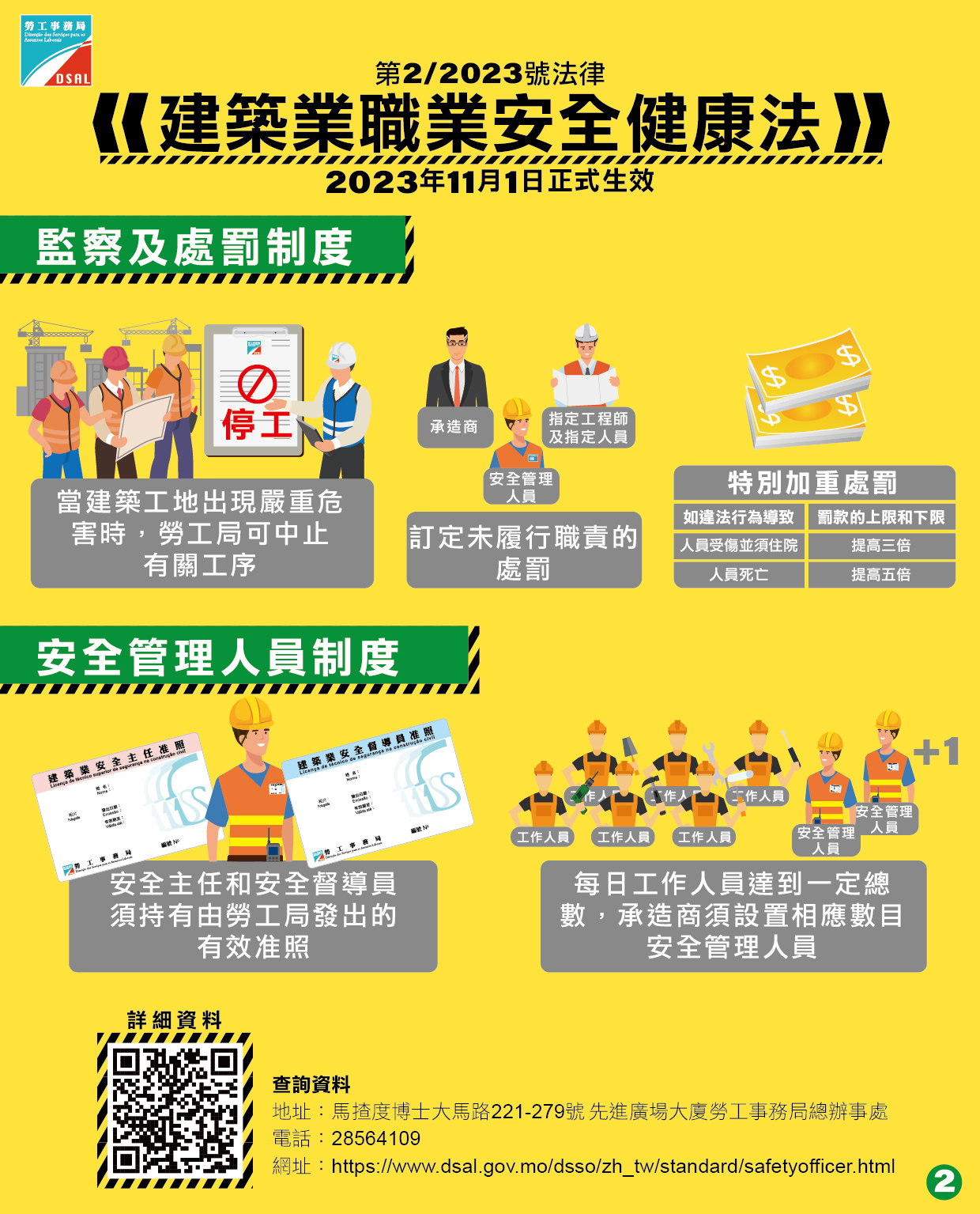 為配合第2/2023號法律《建築業職業安全健康法》的規定,特區政府於本年8月21日在《澳門特別行政區公報》公佈第32/2023號建築業職業安全及健康技術規範行政法規,該法規主要針對建築業現時所採用的施工技術,以及所使用的機械和設備等工作用具的轉變,完善了施工安全規範;就建築業施工經常使用到的設備和常見工序,增加相應的安全措施規定;明確規範須由相關範疇的指定工程師及指定人員進行的工作及具體內容,以及特定工序的施工安全等。有關行政法規將與《建築業職業安全健康法》同於本年11月1日生效。