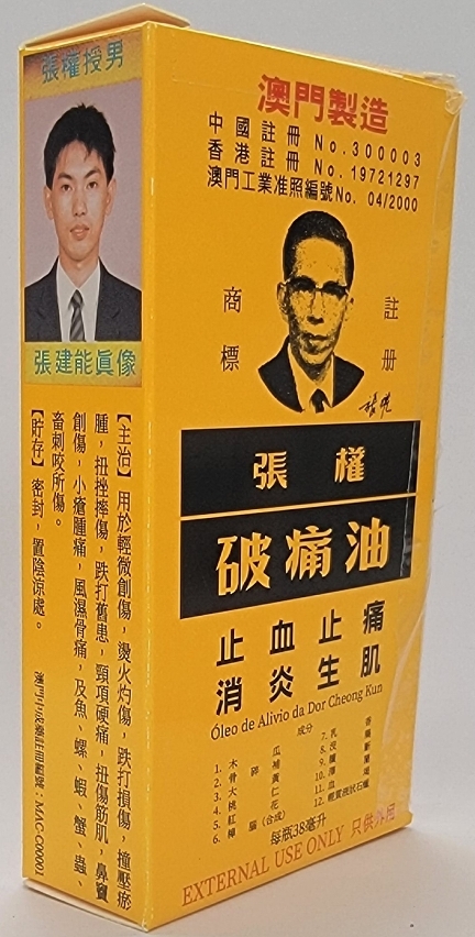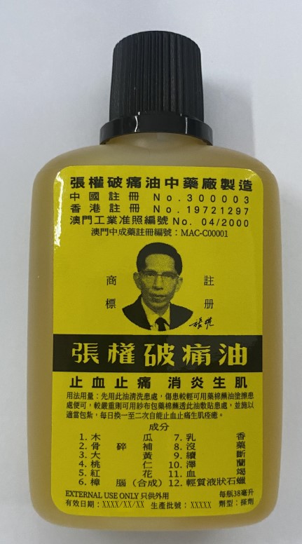 藥物監督管理局接到香港衞生署通報,該署在香港市場上發現一款名為“張權破痛油”的未經註冊的中成藥。根據藥物監督管理局的紀錄,“張權破痛油”是一款由本澳中藥製藥廠生產且已在本澳註冊的中成藥,註冊編號為MAC-C00001,目前本澳市場上銷售的有關產品未見異常情況;另外,藥物監督管理局經與本澳“張權破痛油中藥廠”核實,該廠表示“張權破痛油”在本澳及在香港銷售的包裝式樣不同,在本澳註冊的包裝僅在本澳市場銷售,並沒有將澳門包裝式樣的產品供應給香港市場。