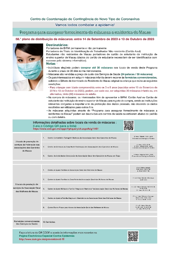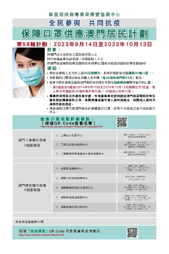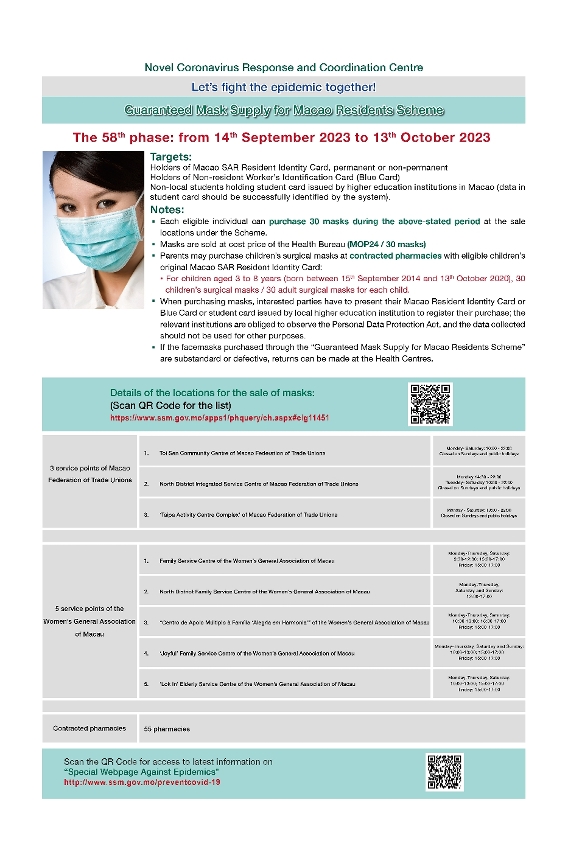 新型冠狀病毒感染應變協調中心(下稱應變協調中心)今(11)日公佈,第58輪保障口罩供應澳門居民計劃(下稱“口罩計劃”)於9月14日開始,具體如下: