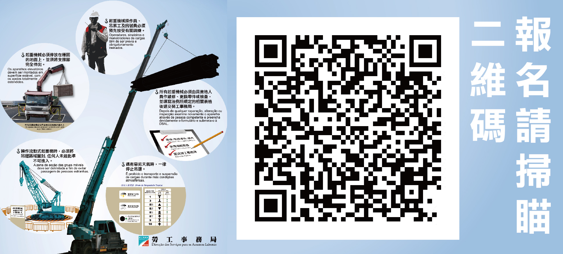 講座邀請業界人士就起重機械和吊具的檢驗主題進行實踐經驗分享,同時勞工局人員會講授《建築業職業安全健康法》法律中與起重機械、吊具、檢驗等相關的法律知識,藉此搭建業界溝通平台,以推廣建築安全相關資訊,構建安全的工作環境。是次講座已獲認可都市建築及城市規劃範疇的持續進修活動3小時 (機械工程專業範疇)。有興趣參加的巿民請透過電子方式報名,講座名額有限,額滿即止。詳細資料及報名請瀏覽勞工事務局職安健天地網頁https://www.dsal.gov.mo/dsso/zh_tw/standard/index.html 。查詢請致電2871 7781。