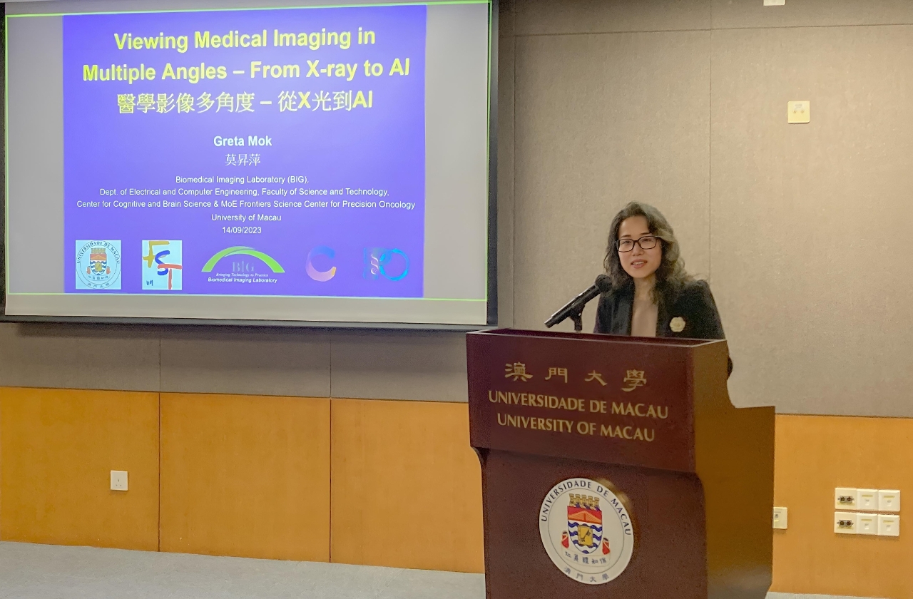 澳門大學今(14)日於大學展館演講廳舉行“澳大學人研究講壇”第13講,由澳大科技學院教授莫昇萍以“醫學影像多角度,從X光到AI”為題發表演說。講座現場座無虛席,多所中學的師生亦於線上參與。