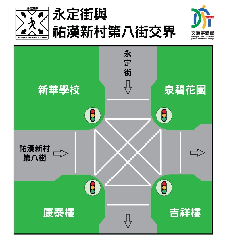 經分析祐漢區內的道路條件、過路環境及車輛通行流量後,將在永定街與祐漢新村第八街交界增設交通燈及斜行過路設施,9月20日(周三)上午完成地面標線及相應配套工作後正式啟用。
