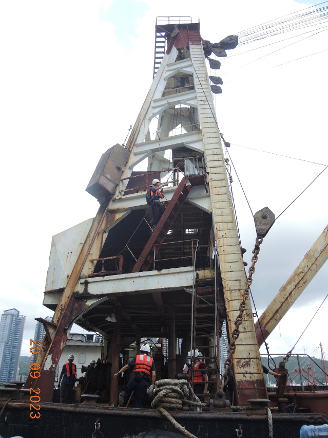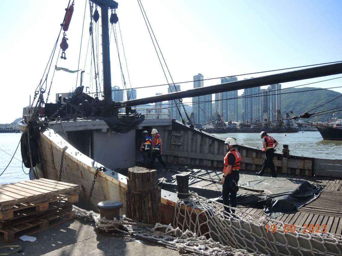 海事局及海關人員巡查內港及九澳多個貨運碼頭的設施設備,並登上靠泊於碼頭的船舶檢查。同時,就船隻的登岸設施、躉船吊運貨物操作、船上安全裝備、貨物起卸區、存放區、維修區和休息區等項目是否符合安全規範作出檢視,現場給予安全提醒和意見。