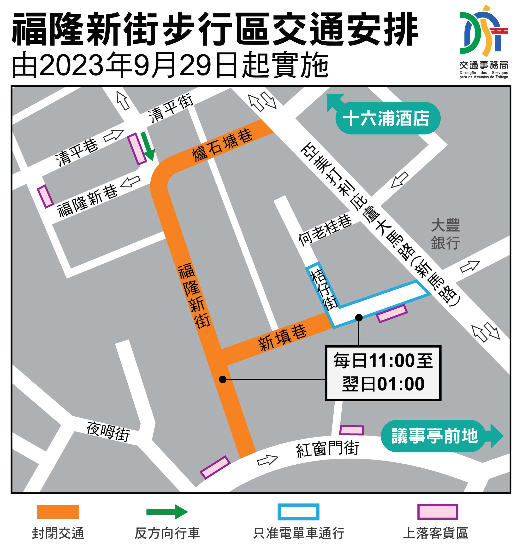 配合文化局福隆新街步行區計劃的實施,自2023年9月29日起,福隆新街及周邊道路實際附表之交通安排,活動期間巴士服務不受影響。敬請巿民及駕駛者留意。