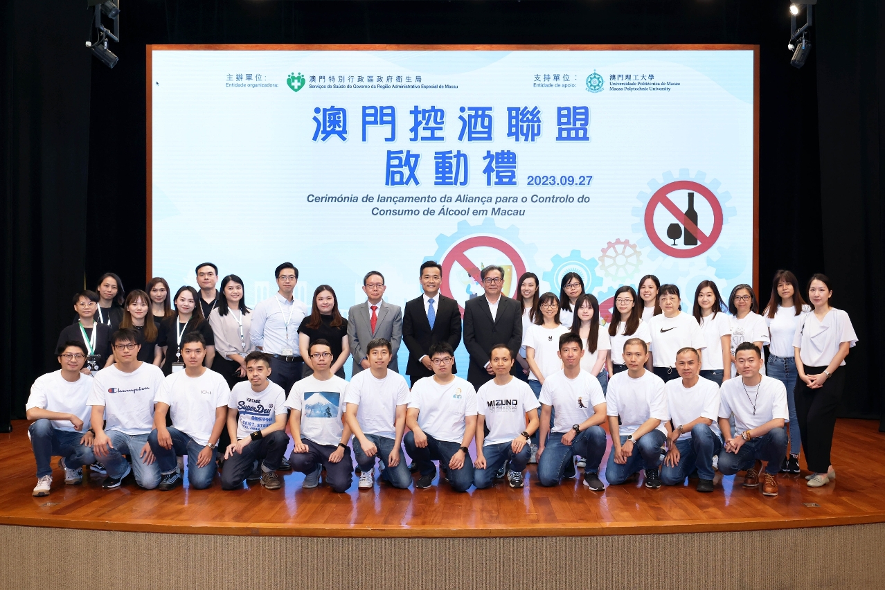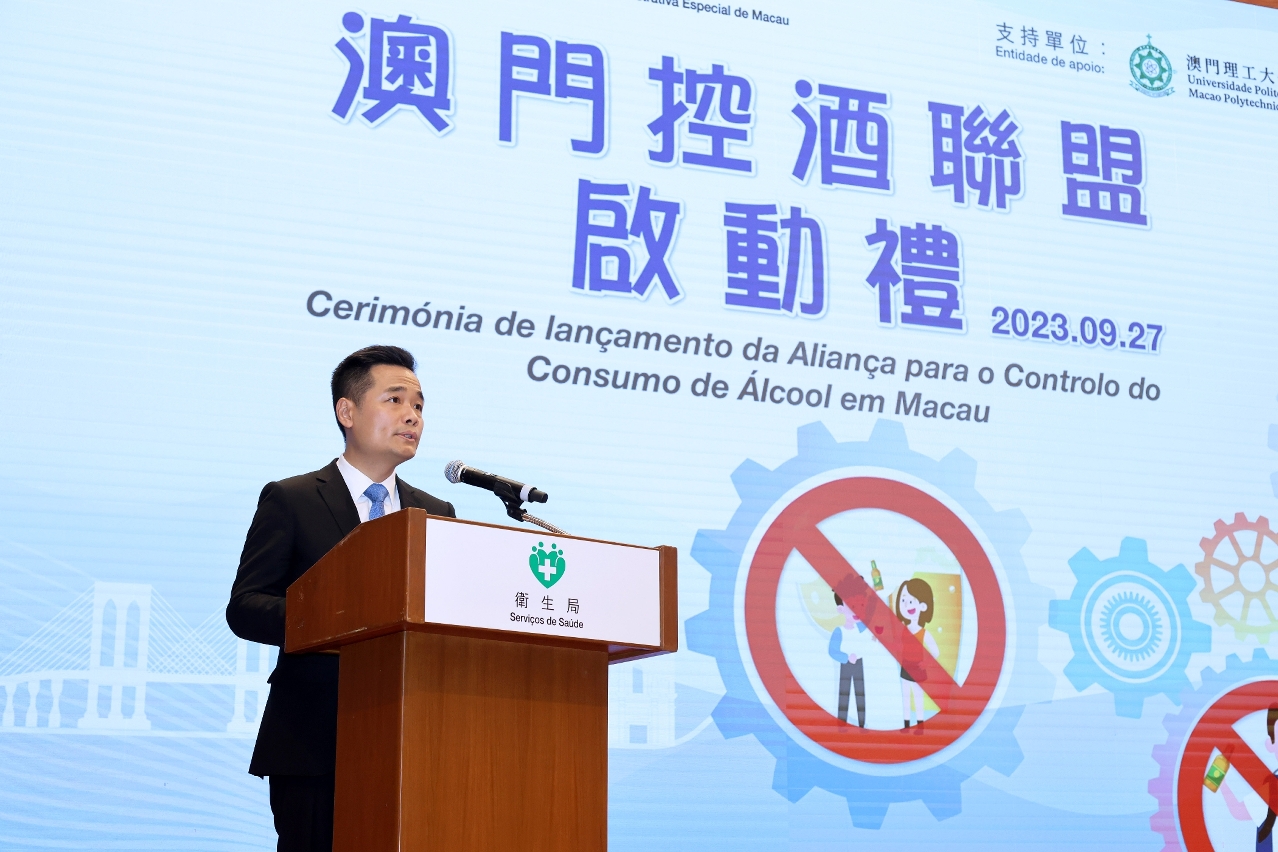 衛生局今(27)日舉行“澳門控酒聯盟”啟動禮,社會文化司歐陽瑜司長、社會文化司司長辦公室何鈺珊主任、衛生局羅奕龍局長、社會工作局韓衛局長、旅遊局許耀明副局長、市政署市政管理委員會杜淑儀委員和治安警察局源劍鋒代廳長等,作為主禮嘉賓出席了啟動儀式並宣佈“澳門控酒聯盟”正式啟動。該聯盟由相關政府部門及社會各界共33個團體單位組成,透過聯盟建立良好的夥伴關係,凝聚社會共識和力量,攜手合作,齊心協力推動本澳控酒工作,共同向社會大眾傳遞預防未成年人接觸及飲用酒精飲料的訊息。