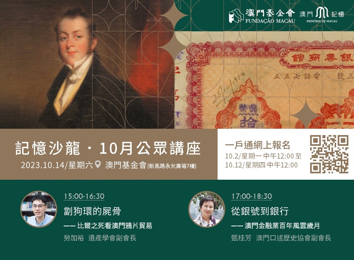 澳門基金會開展的“澳門記憶”文史網將於10月舉辦“記憶沙龍”公眾講座,分別邀請到遺產學會副會長勞加裕主講“劏狗環的屍骨—比爾之死看澳門鴉片貿易”及澳門口述歷史協會副會長甄桂芳主講“從銀號到銀行—澳門金融業百年風雲歲月”,將於10月2日中午12時開始接受報名。