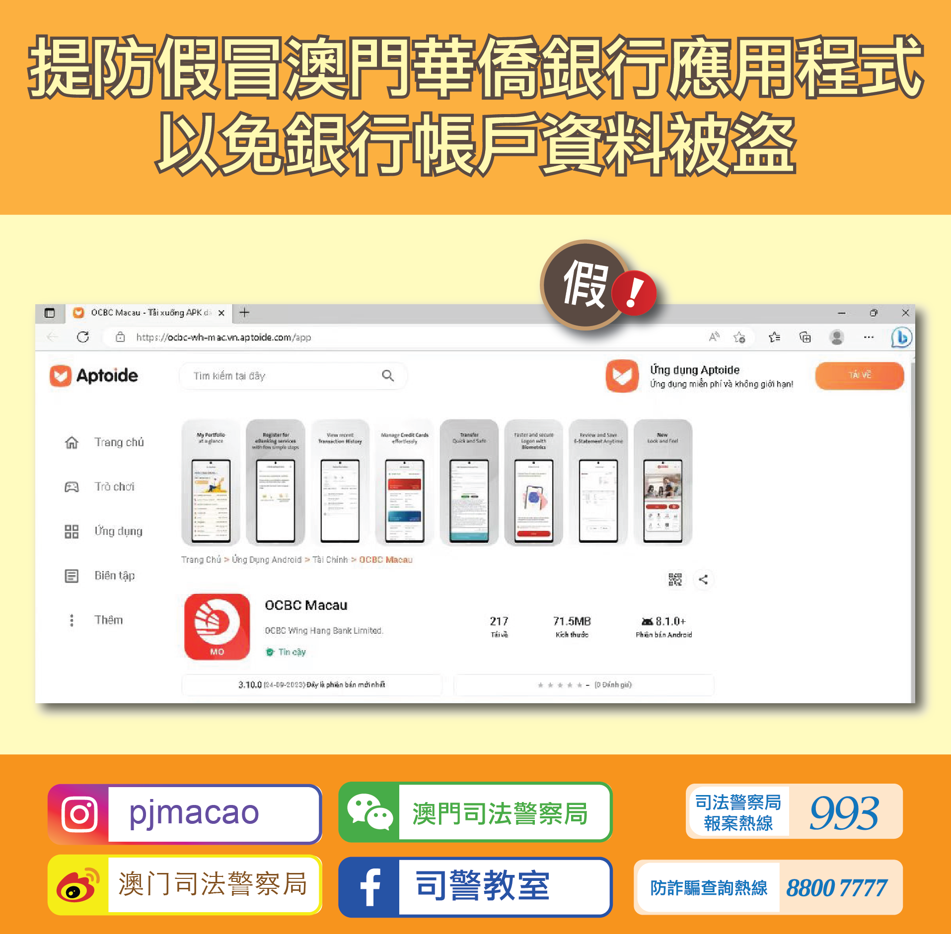 司警局於今日接獲澳門華僑銀行通報,發現有第三方的手機應用程式下載平台出現假冒該銀行的應用程式,該程式的名字、圖示以至介面均與官方的極為相似,懷疑不法之徒假冒銀行開設釣魚應用程式,藉此騙取市民銀行帳戶、登錄密碼及交易密碼等重要資料。