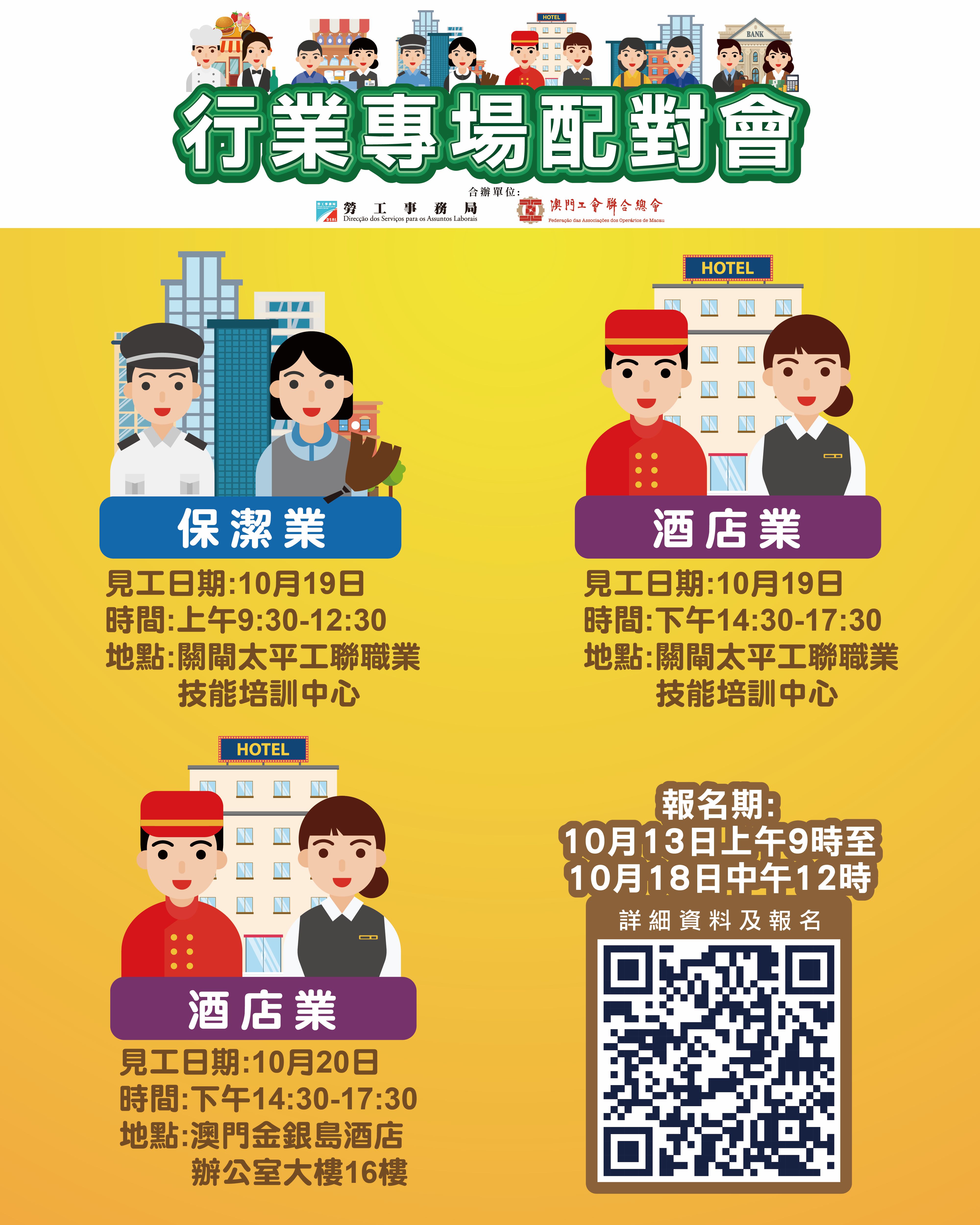 為協助有求職需求的澳門居民盡快就業,以及為緩解業界的人資需求壓力,勞工事務局與澳門工會聯合總會合作,10月第三周舉辦3場行業專場配對會,合共提供357個空缺。報名日期為10月13日上午9時至10月18日中午12時。