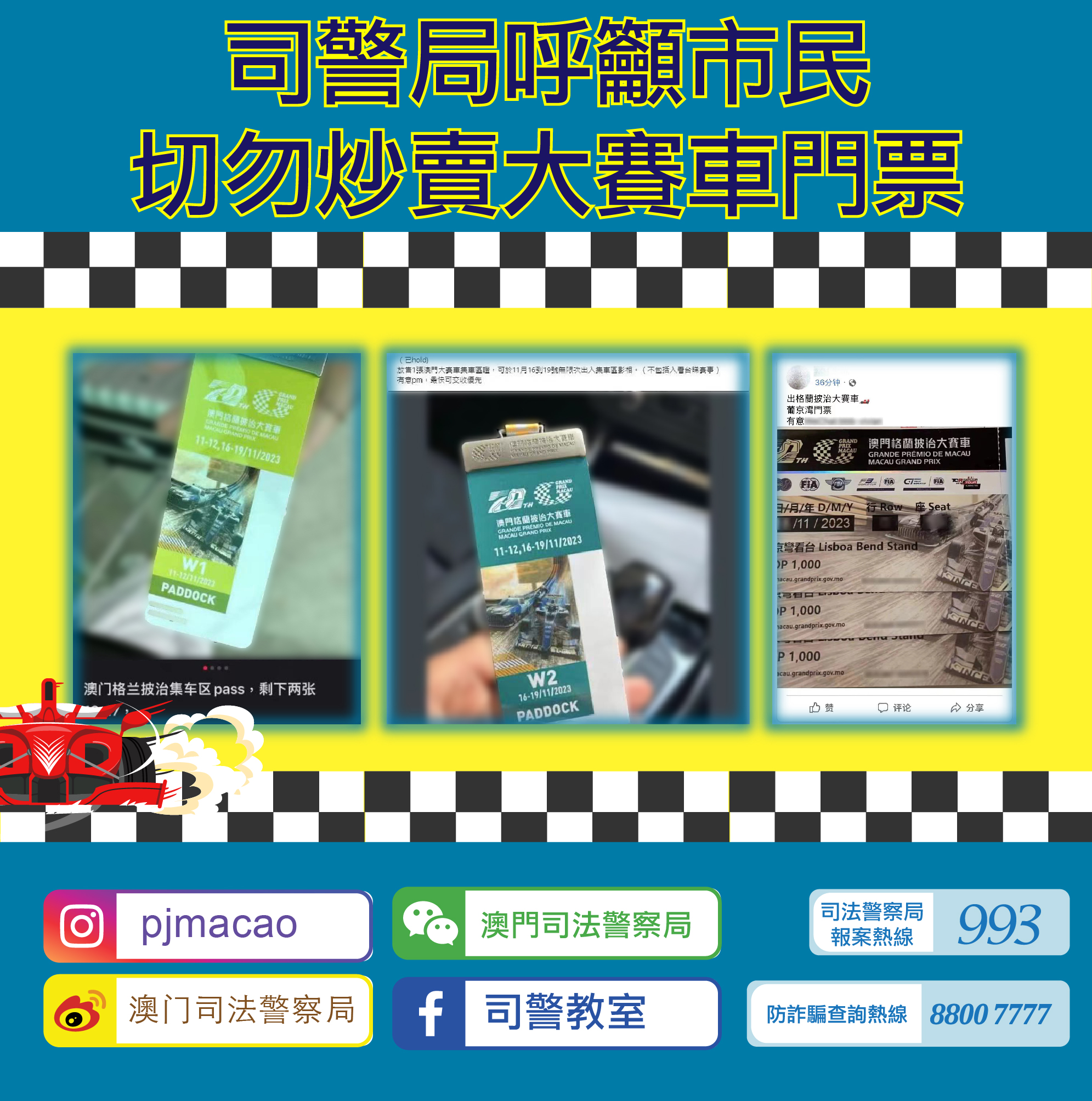 近日,司法警察局發現有人於網上社交平台炒賣第70屆澳門格蘭披治大賽車定價門票、大會贈券以及特許通行證。