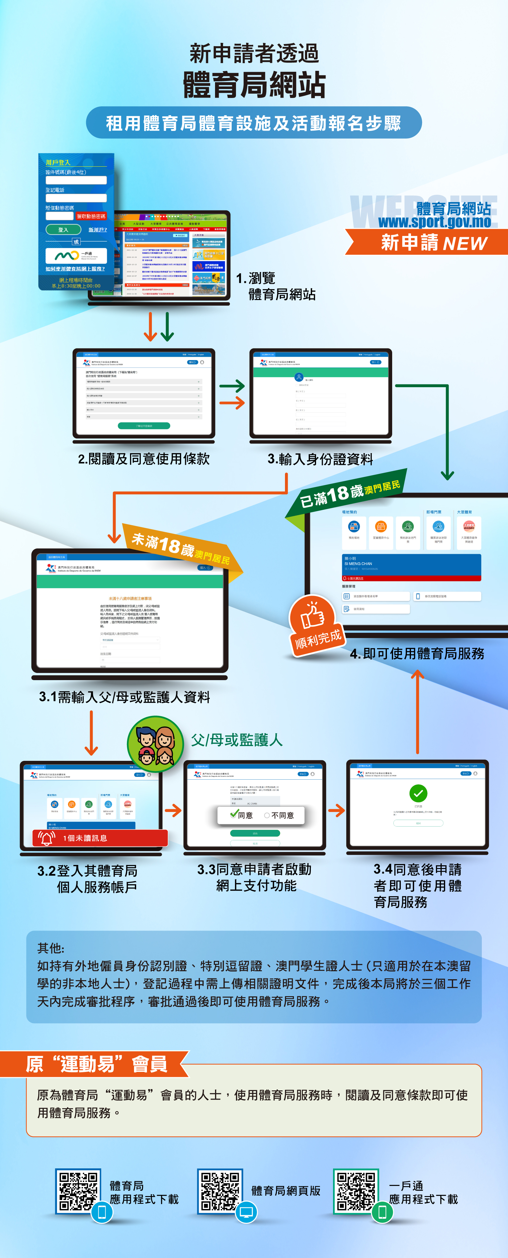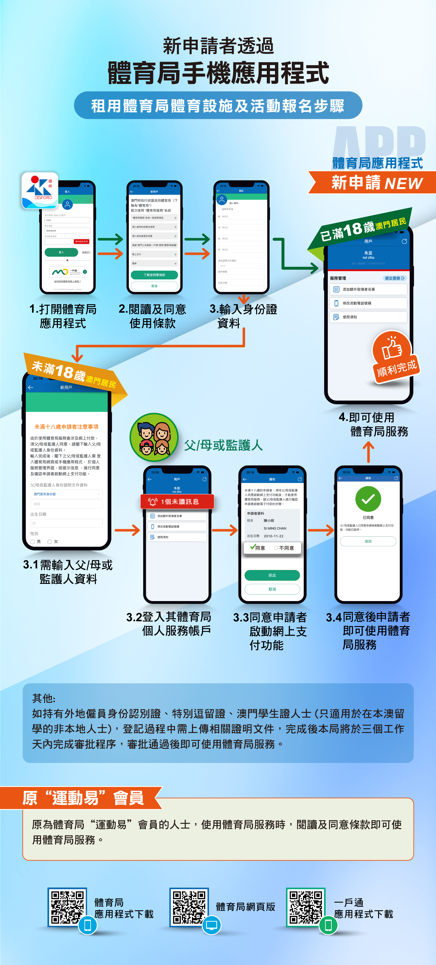 | *由於使用體育局服務涉及網上付款,因此18歲以下的人士需獲得父母或監護人同意,並可透過“一戶通”、體育局網站或體育局手機應用程式於線上進行有關操作。 |
