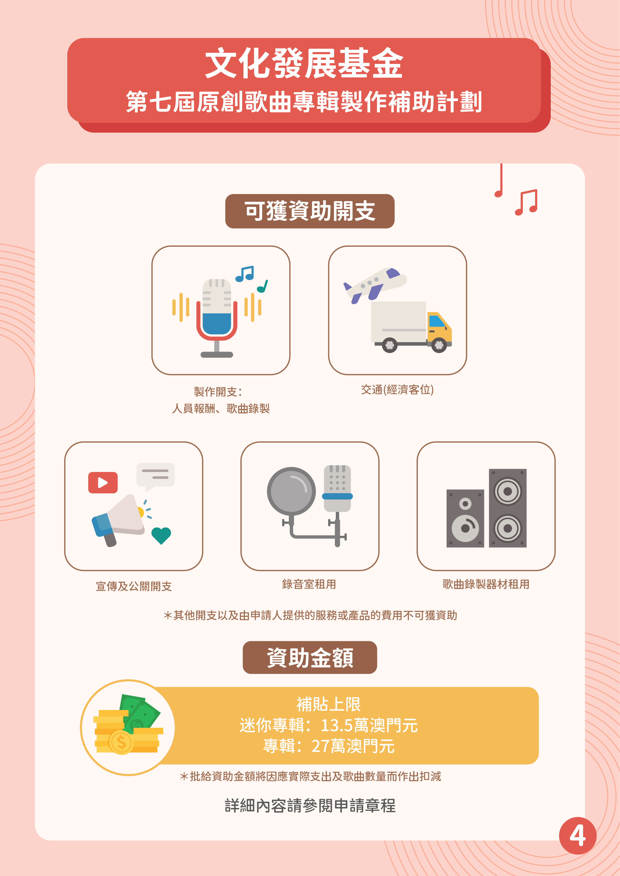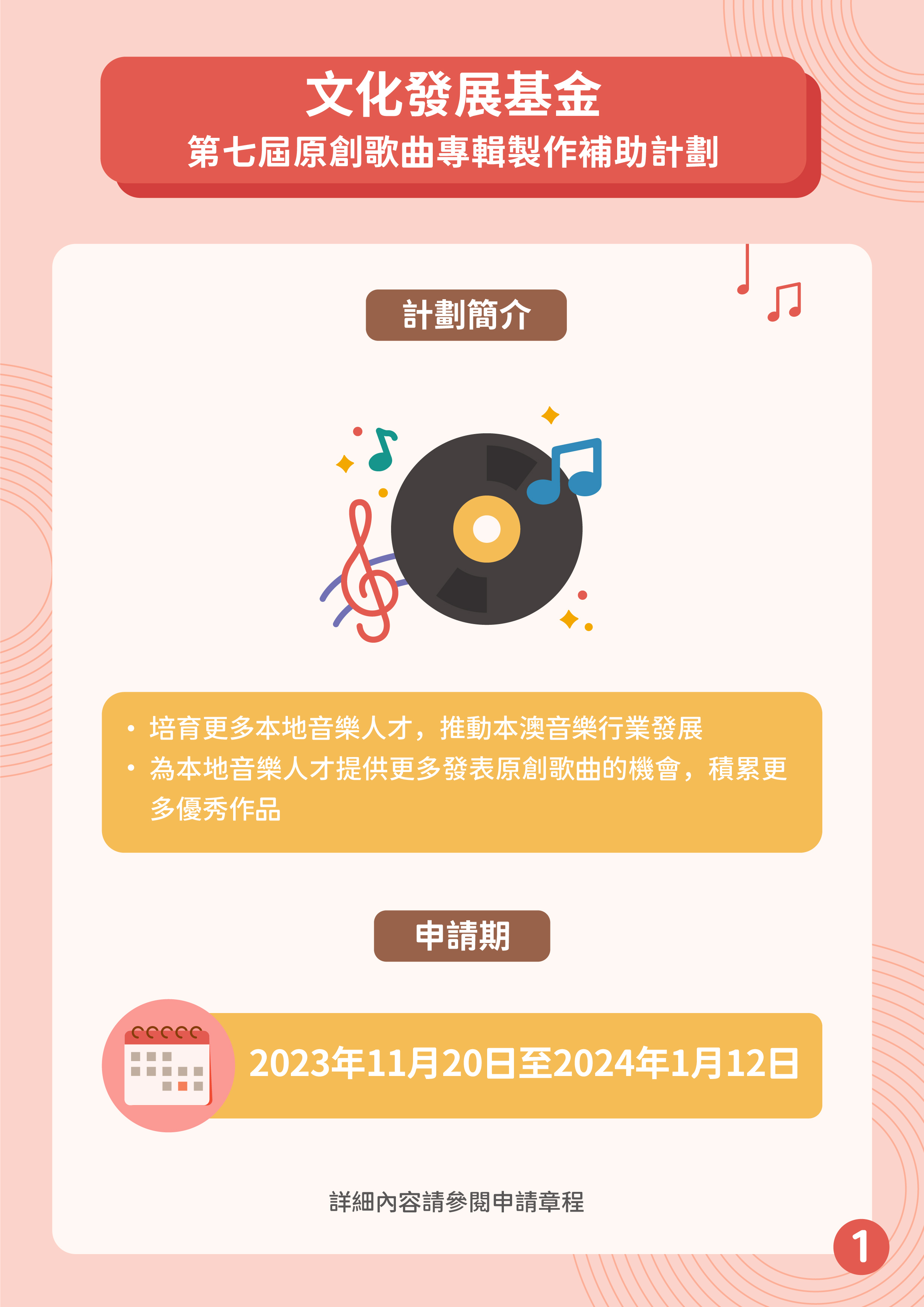 文化發展基金推出“第七屆原創歌曲專輯製作補助計劃”,培育本地音樂人才,為其提供更多發表原創歌曲的機會,逐步開拓市場,推動本澳音樂行業發展。