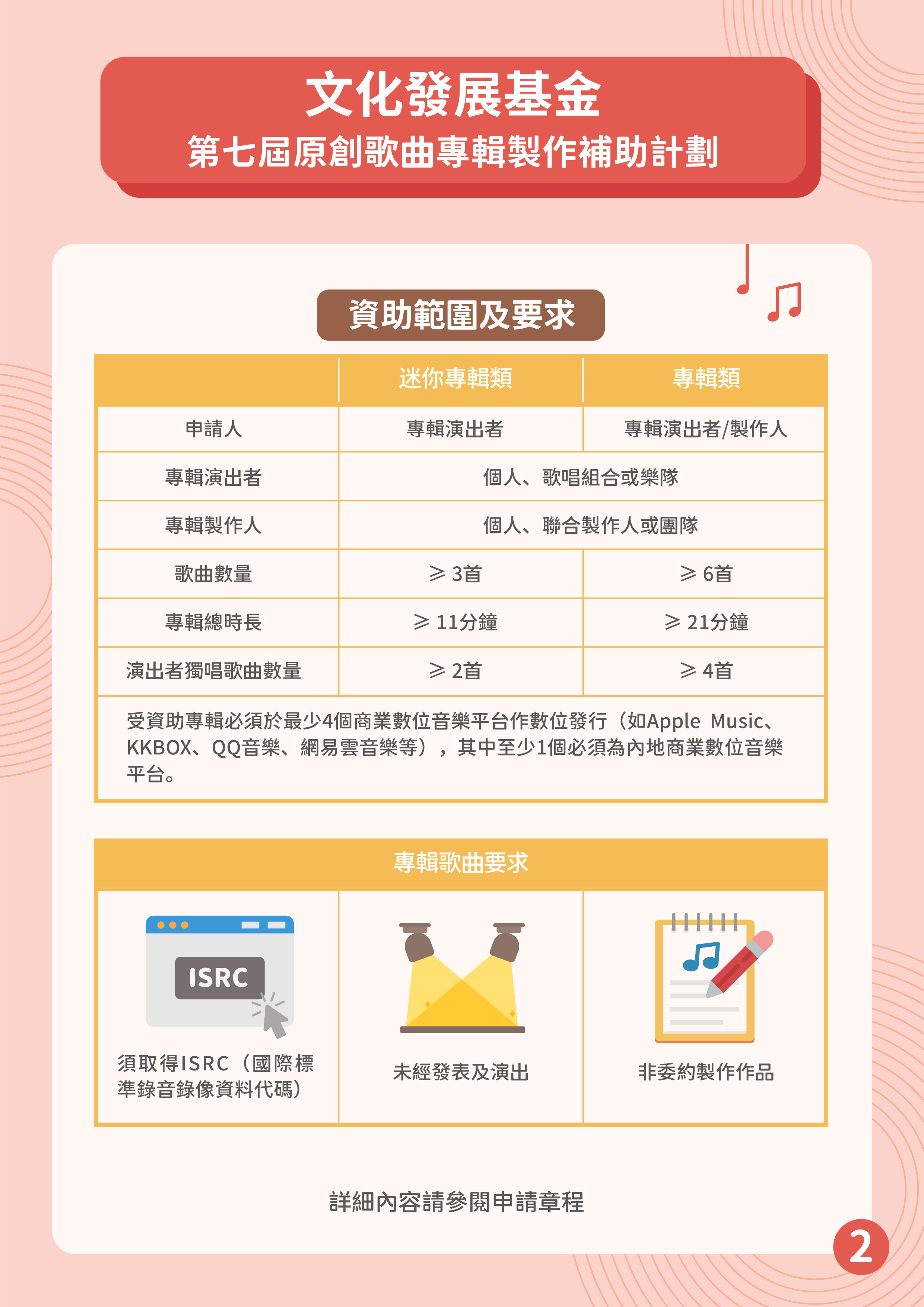 “第七屆原創歌曲專輯製作補助計劃”申請期由2023年11月20日至2024年1月12日。資助的專輯類型分為“迷你專輯”及“專輯”兩類,不包括合輯及精選輯。所有歌曲須為未經發表及演出的非委約作品,“迷你專輯”須包含至少3首歌曲,“專輯”則須至少6首。受資助專輯必須於最少4個商業數位音樂平台作數位發行,其中至少1個必須為內地商業數位音樂平台。
