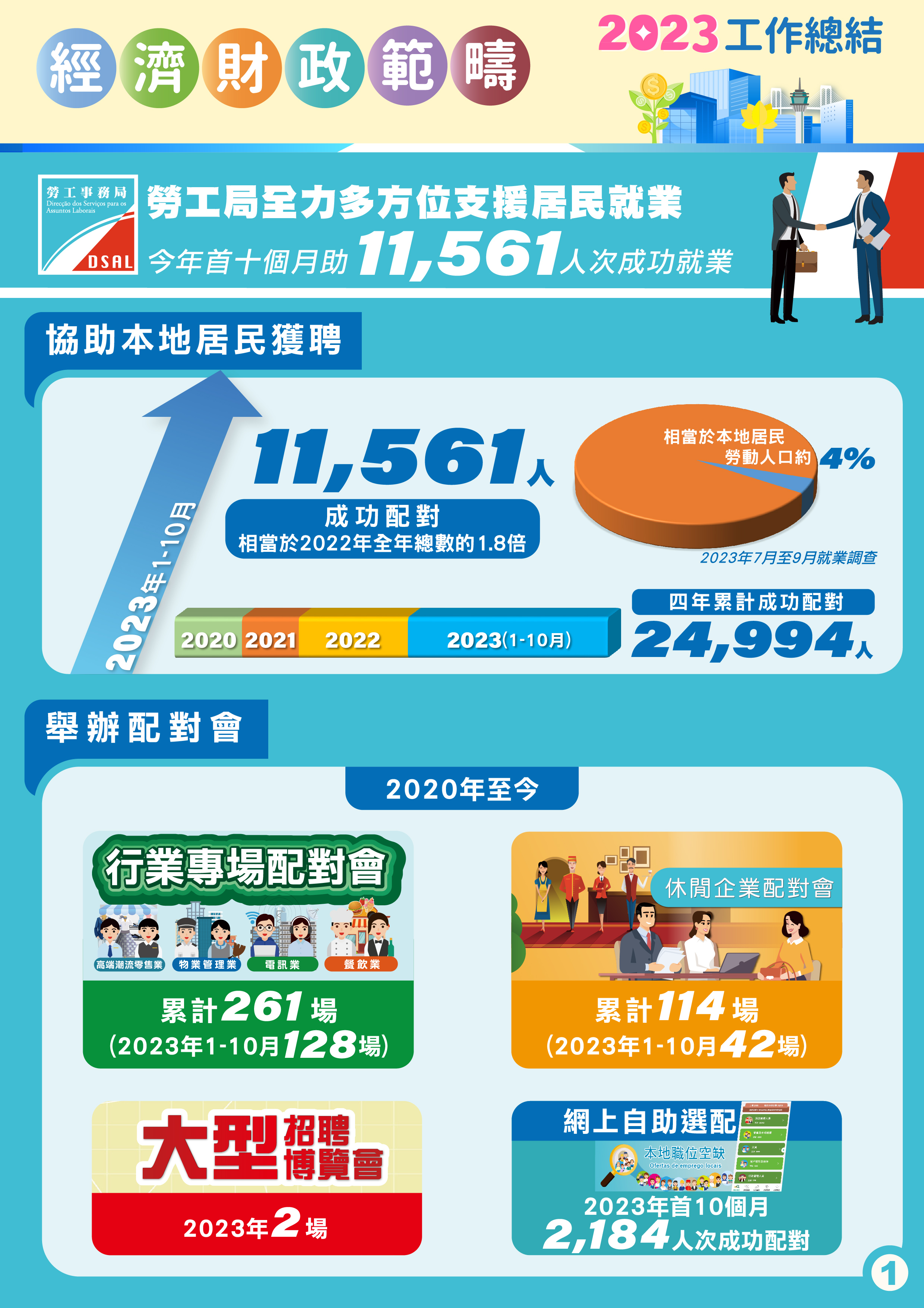 勞工局積極推動居民就業,2023年1月至10月累計協助11,561人次獲聘,涉及建築業有808人,為去年2022年全年透過勞工局成功就業人數(6288人次)的1.8倍,約相當於2023年7月至9月就業調查中本地居民勞動人口的4%。