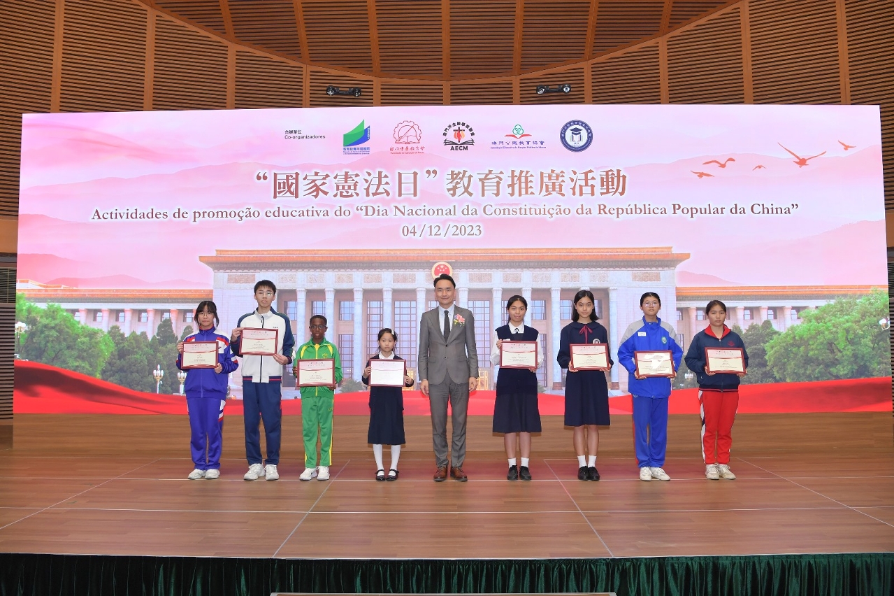 為加深青年學生對《憲法》和《基本法》的認識,教育及青年發展局聯同澳門中華教育會、澳門天主教學校聯會、澳門公職教育協會及澳門高等教育發展促進會於12月4日在澳門科學館會議廳舉辦國家憲法日教育推廣活動。社會文化司司長歐陽瑜、中央人民政府駐澳門特別行政區聯絡辦公室教育與青年工作部部長李雪飛、教育及青年發展局局長龔志明、澳門基金會行政委員會委員區榮智、教青局副局長丁少雄、阮佩賢及黃嘉祺、澳門中華教育會會長陳虹、理事長鄭洪光、澳門高等教育發展促進會會長莫啓明、澳門天主教學校聯會會長周伯輝、澳門公職教育協會會員大會主席劉文堯、教育委員會委員、青年事務委員會委員、澳門高等院校及非高等教育學校校長及代表,以及教青局主管等出席。