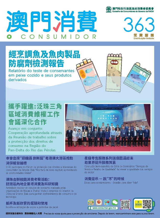 第363期《澳門消費》刊登經烹調魚及魚肉製品防腐劑檢測報告,10款抽查樣本的防腐劑含量符合本澳法規要求。新一期《澳門消費》亦介紹了泛珠合作加強消保工作聯動的各項成果。