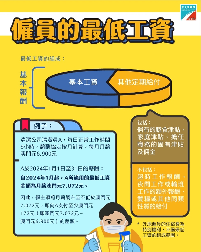 設立最低工資的目的為防止僱員工資過低。而按有關數據顯示,在首個的實施週期內低薪僱員的薪酬有所提升,反映最低工資的實施對防止低薪僱員工資過低具有積極作用。勞工局會依法於2024年11月1日進行第二次的檢討工作,並會結合社會各界對調升僱員的最低工資的意見,持續完善相關工作。