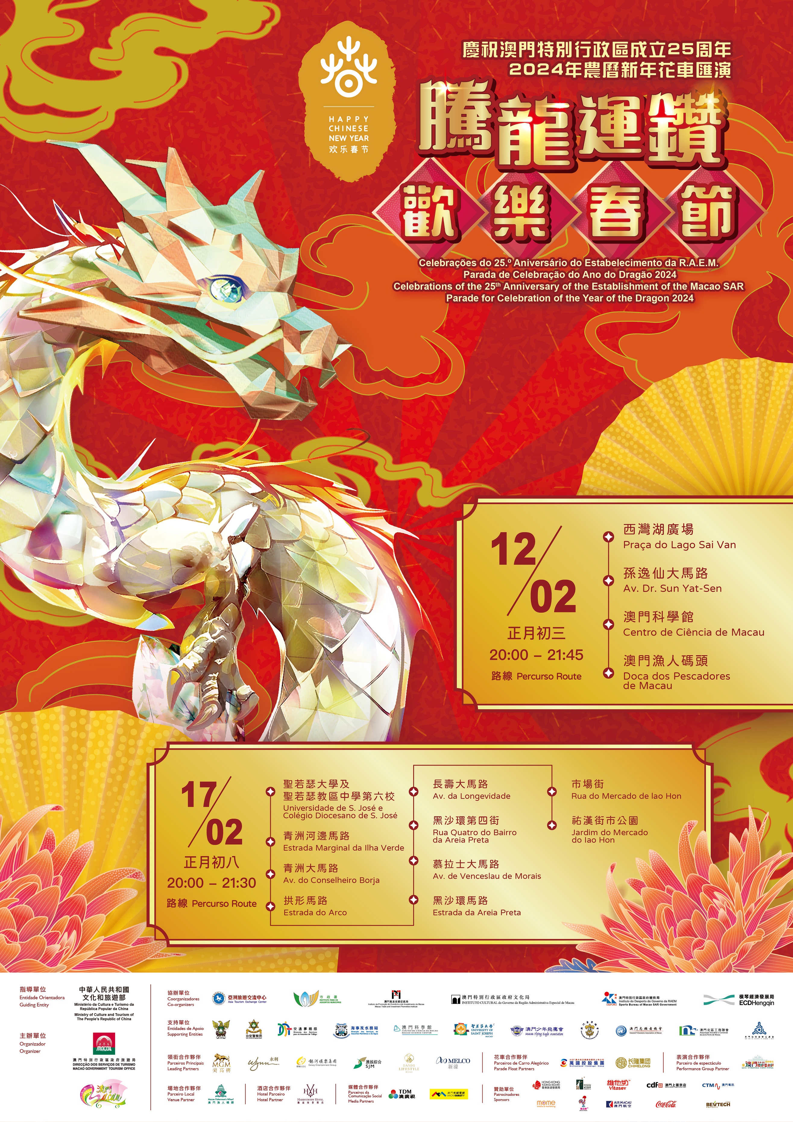 大型賀歲活動“慶祝澳門特別行政區成立25周年 2024年農曆新年花車匯演 騰龍運鑽歡樂春節”將於年初三(2月12日)及年初八(2月17日)分別在中區及北區舉行,精彩內容包括暖場表演、開幕演出、花車巡遊、文藝表演、花車展覽和線上遊戲等。年初三晚上8時將在西灣湖廣場舉行盛大開幕式,當晚花車匯演後獻上首場煙花表演,延伸喜慶氣氛,發揮盛事疊加效應,助力推動夜經濟。